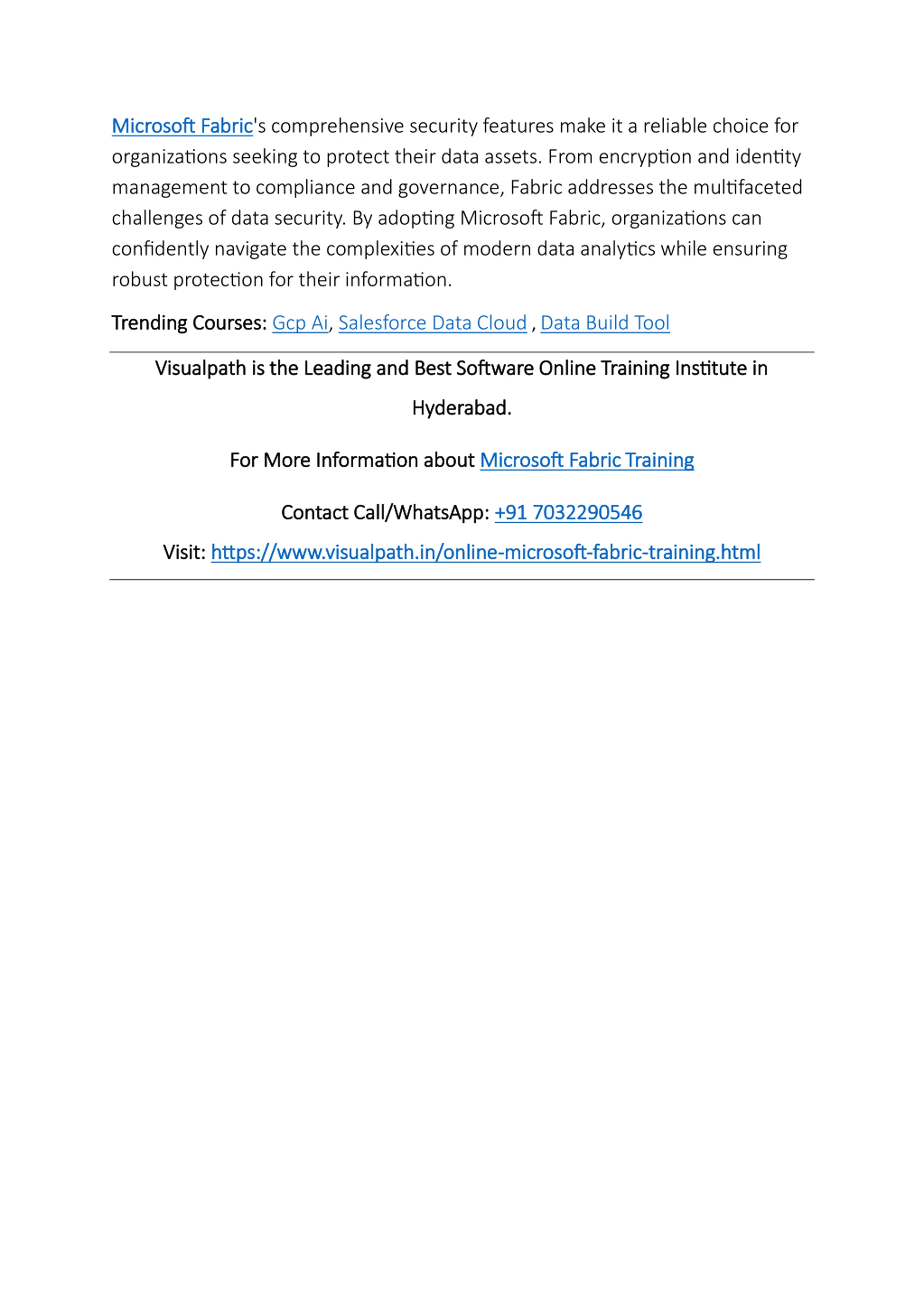 Microsoft Fabric Microsoft Fabric's comprehensive security features make it a reliable choice for organizations seeking to protect their data assets. From encryption and identity management to compliance and governance, Fabric addresses the multifaceted challenges of data security. By adopting Microsoft Fabric, organizations can confidently navigate the complexities of modern data analytics while ensuring robust protection for their information. Trending Trending Courses Courses: : Gcp Ai, Salesforce Data Cloud , Data Build Tool Visualpath is the Leading and Best Software Online Training Institute in Visualpath is the Leading and Best Software Online Training Institute in Hyderabad. Hyderabad. For More Information about For More Information about Microsoft Fabric Microsoft FabricTraining Training Contact Call/WhatsApp: Contact Call/WhatsApp: +91 7032290546 +91 7032290546 Visit: Visit: https://www.visualpath.in/online https://www.visualpath.in/online- -microsoft microsoft- -fabric fabric- -training.html training.html