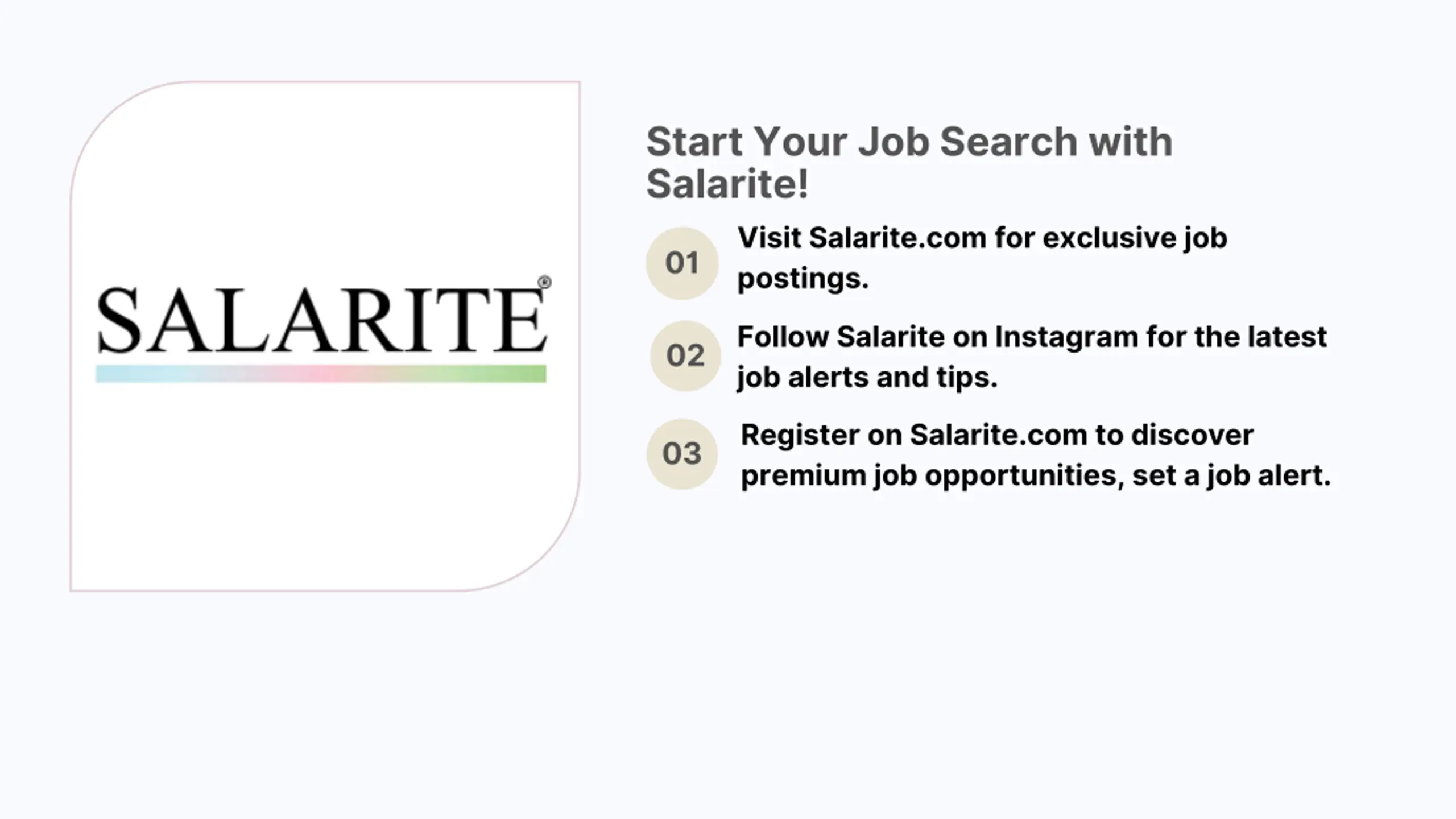 Start Your Job Search with Salarite! Visit Salarite.com for exclusive job postings. 01 Follow Salarite on Instagram for the latest job alerts and tips. 02 Register on Salarite.com to discover premium job opportunities, set a job alert. 03