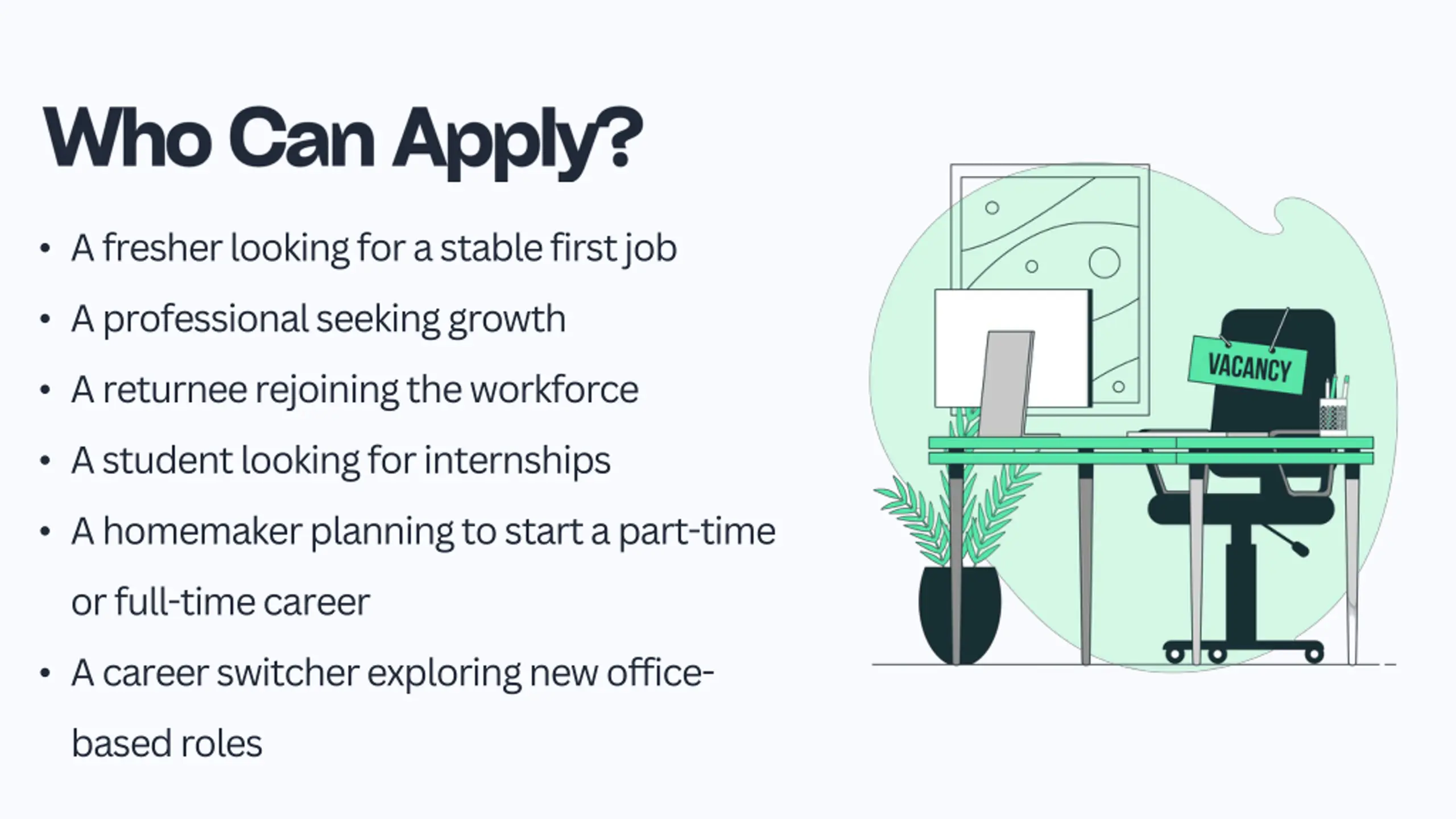 3. A fresher looking for a stable first job A professional seeking growth A returnee rejoining the workforce A student looking for internships A homemaker planning to start a part-time or full-time career A career switcher exploring new office- based roles
