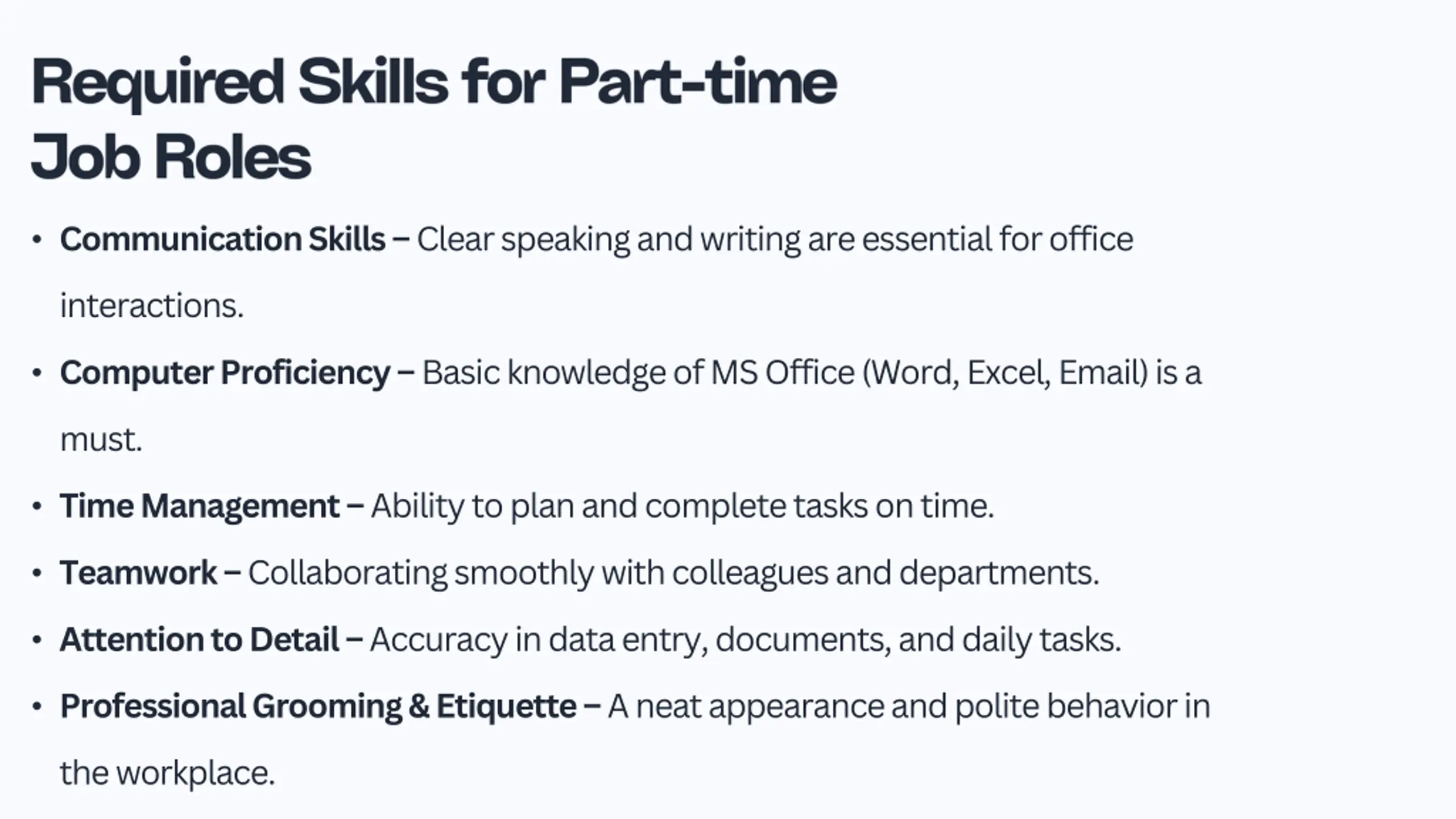 5. Communication Skills Clear speaking and writing are essential for office interactions. Computer Proficiency Basic knowledge of MS Office (Word, Excel, Email) is a must. Time Management Ability to plan and complete tasks on time. Teamwork Collaborating smoothly with colleagues and departments. Attention to Detail Accuracy in data entry, documents, and daily tasks. Professional Grooming & Etiquette A neat appearance and polite behavior in the workplace.