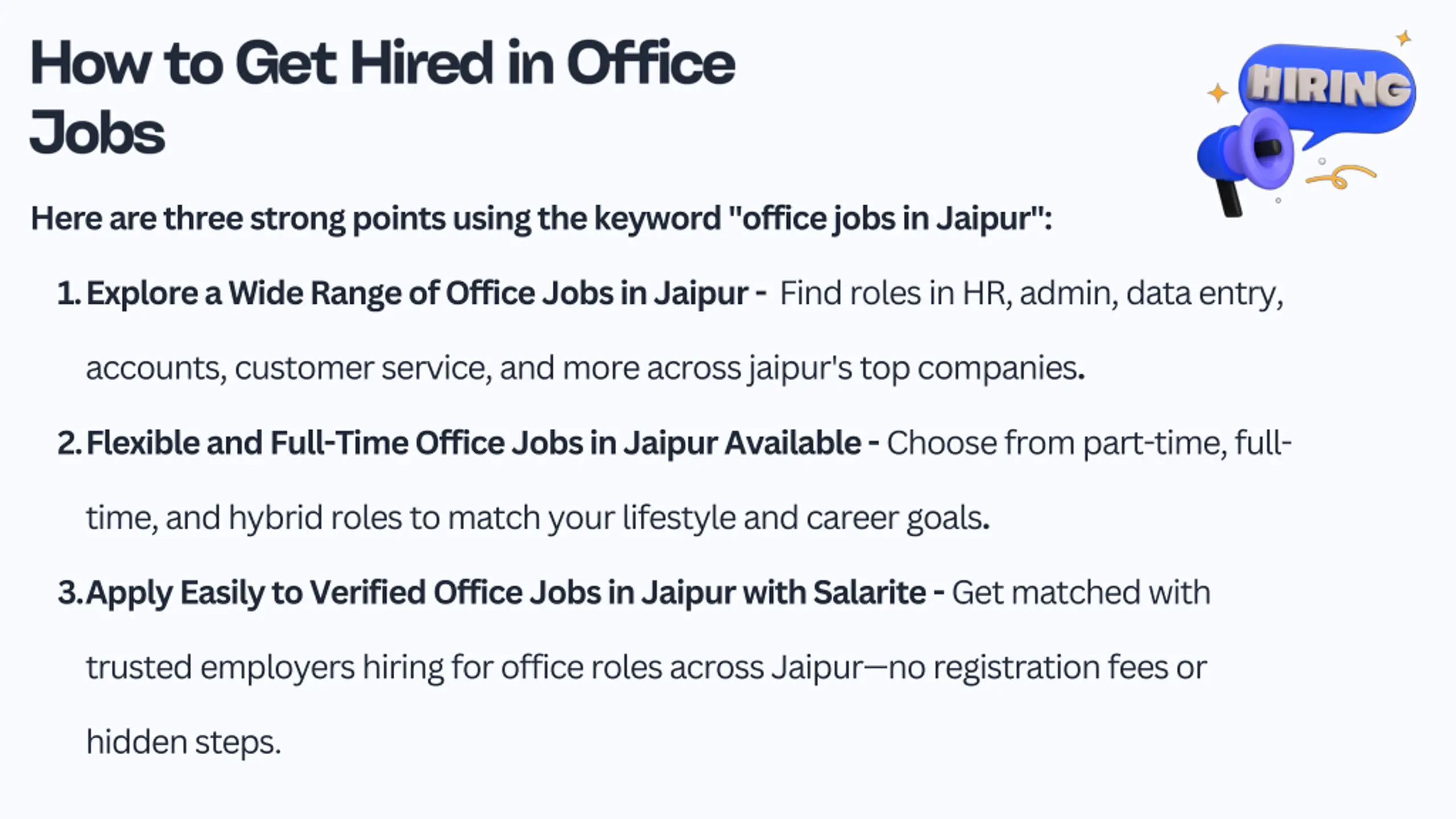 6. Here are three strong points using the keyword "office jobs in Jaipur": 1.Explore a Wide Range of Office Jobs in Jaipur - Find roles in HR, admin, data entry, accounts, customer service, and more across jaipur's top companies. 2.Flexible and Full-Time Office Jobs in Jaipur Available - Choose from part-time, full- time, and hybrid roles to match your lifestyle and career goals. 3.Apply Easily to Verified Office Jobs in Jaipur with Salarite - Get matched with trusted employers hiring for office roles across Jaipur no registration fees or hidden steps.