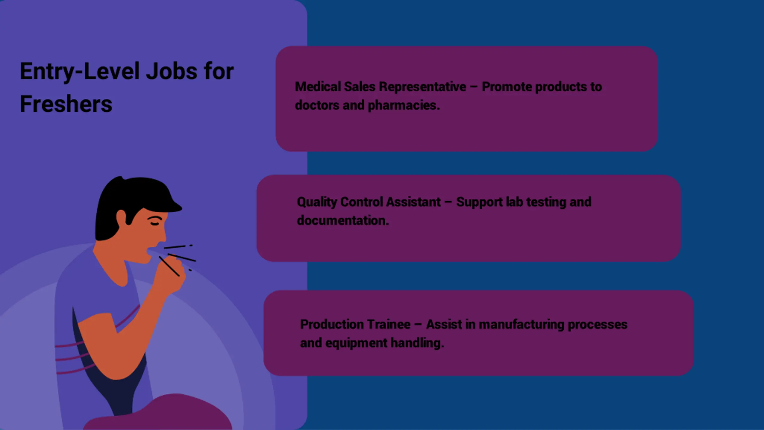 Entry-Level Jobs for Freshers Medical Sales Representative Promote products to doctors and pharmacies. Quality Control Assistant Support lab testing and documentation. Production Trainee Assist in manufacturing processes and equipment handling.
