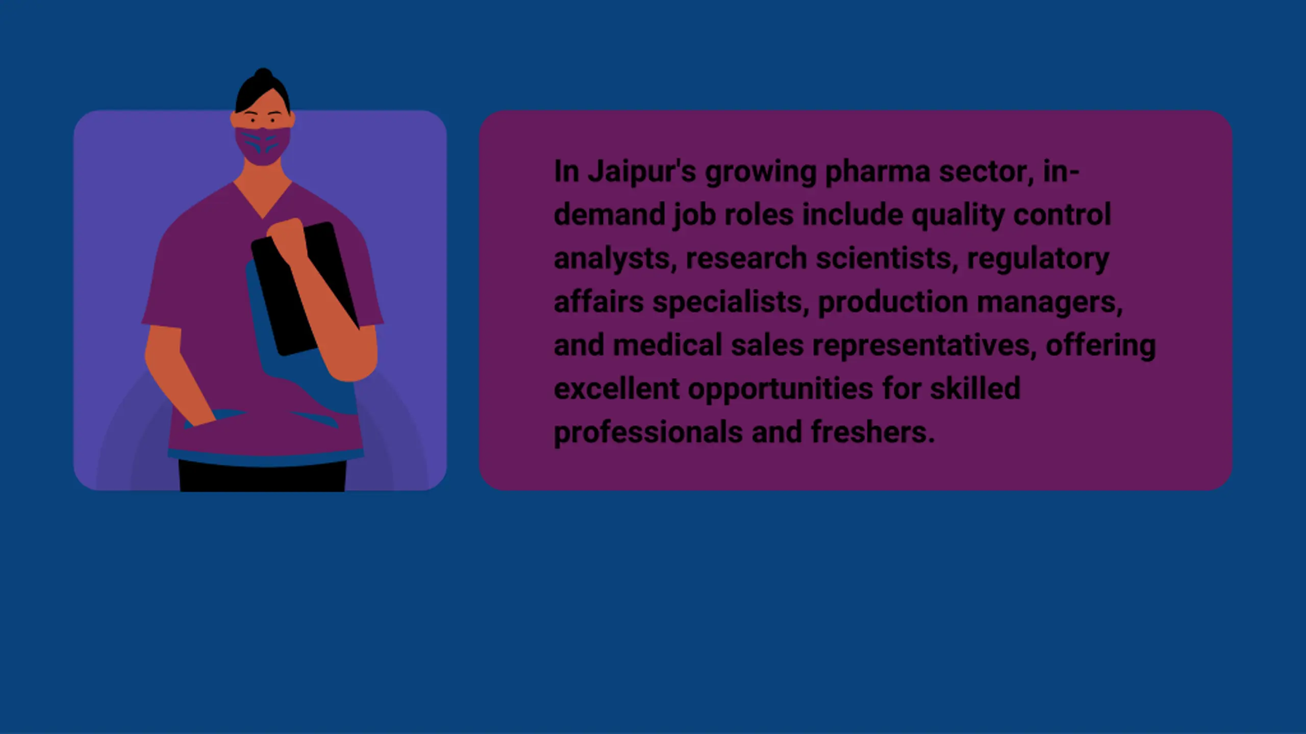 In Jaipur's growing pharma sector, in- demand job roles include quality control analysts, research scientists, regulatory affairs specialists, production managers, and medical sales representatives, offering excellent opportunities for skilled professionals and freshers.
