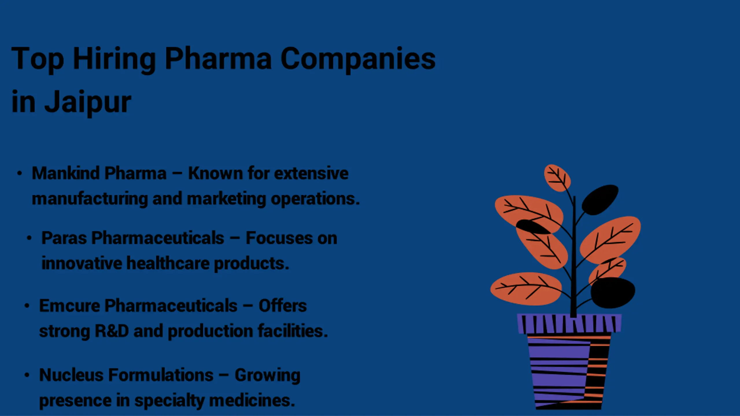 Top Hiring Pharma Companies in Jaipur Mankind Pharma Known for extensive manufacturing and marketing operations. Paras Pharmaceuticals Focuses on innovative healthcare products. Emcure Pharmaceuticals Offers strong R&D and production facilities. Nucleus Formulations Growing presence in specialty medicines.