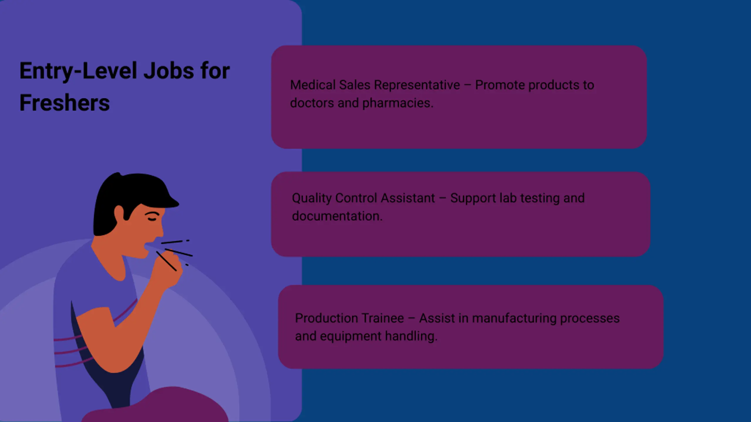 Entry-Level Jobs for Freshers Medical Sales Representative Promote products to doctors and pharmacies. Quality Control Assistant Support lab testing and documentation. Production Trainee Assist in manufacturing processes and equipment handling.