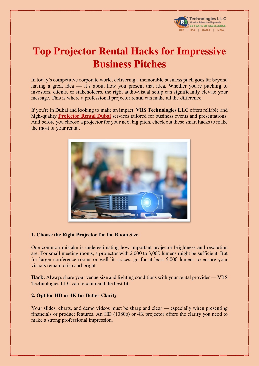 Top Projector Rental Hacks for Impressive Business Pitches In today s competitive corporate world, delivering a memorable business pitch goes far beyond having a great idea it s about how you present that idea. Whether you're pitching to investors, clients, or stakeholders, the right audio-visual setup can significantly elevate your message. This is where a professional projector rental can make all the difference. If you're in Dubai and looking to make an impact, VRS Technologies LLC offers reliable and high-quality Projector Rental Dubai services tailored for business events and presentations. And before you choose a projector for your next big pitch, check out these smart hacks to make the most of your rental. 1. Choose the Right Projector for the Room Size One common mistake is underestimating how important projector brightness and resolution are. For small meeting rooms, a projector with 2,000 to 3,000 lumens might be sufficient. But for larger conference rooms or well-lit spaces, go for at least 5,000 lumens to ensure your visuals remain crisp and bright. Hack: Always share your venue size and lighting conditions with your rental provider VRS Technologies LLC can recommend the best fit. 2. Opt for HD or 4K for Better Clarity Your slides, charts, and demo videos must be sharp and clear especially when presenting financials or product features. An HD (1080p) or 4K projector offers the clarity you need to make a strong professional impression.