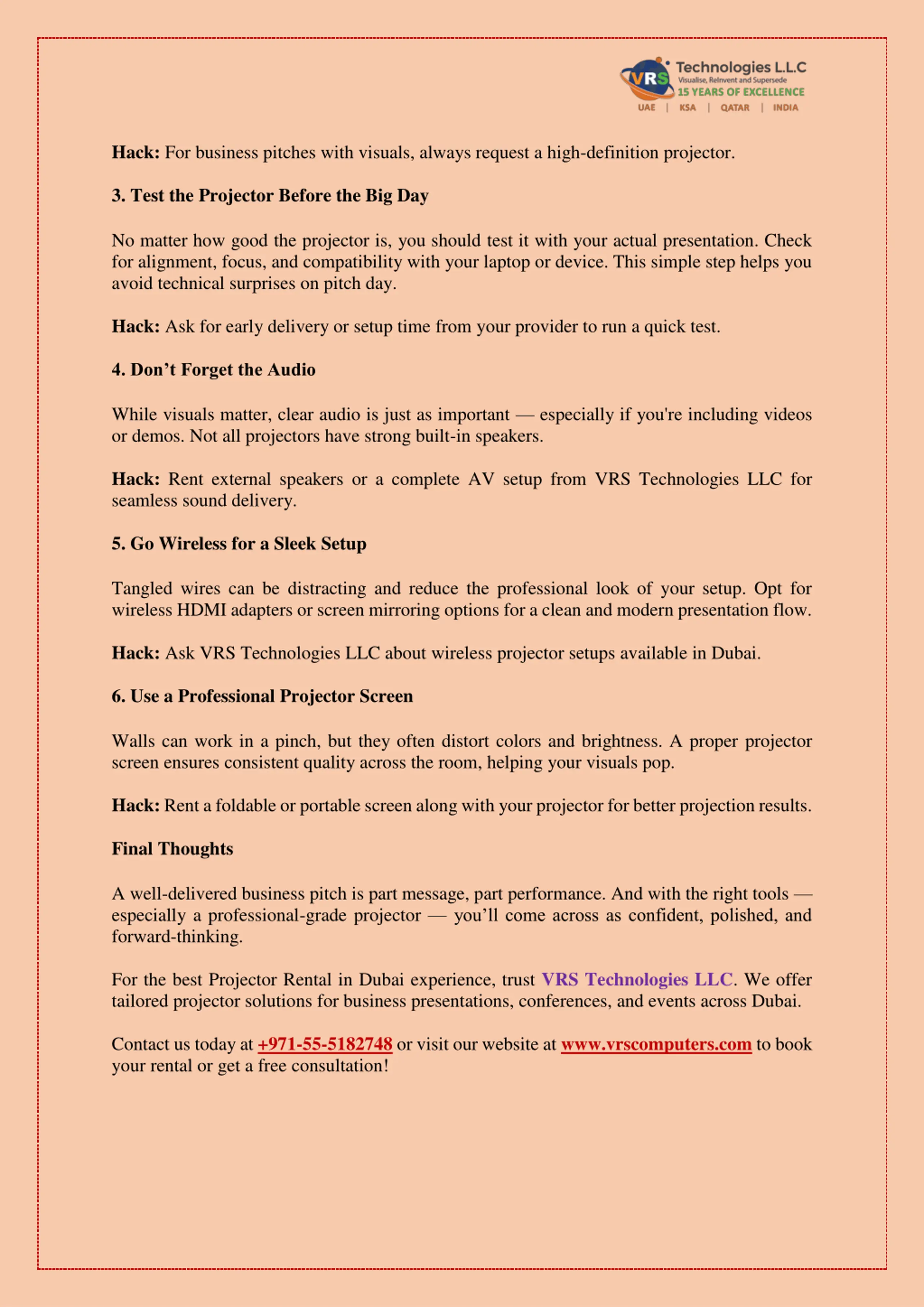 Hack: For business pitches with visuals, always request a high-definition projector. 3. Test the Projector Before the Big Day No matter how good the projector is, you should test it with your actual presentation. Check for alignment, focus, and compatibility with your laptop or device. This simple step helps you avoid technical surprises on pitch day. Hack: Ask for early delivery or setup time from your provider to run a quick test. 4. Don t Forget the Audio While visuals matter, clear audio is just as important especially if you're including videos or demos. Not all projectors have strong built-in speakers. Hack: Rent external speakers or a complete AV setup from VRS Technologies LLC for seamless sound delivery. 5. Go Wireless for a Sleek Setup Tangled wires can be distracting and reduce the professional look of your setup. Opt for wireless HDMI adapters or screen mirroring options for a clean and modern presentation flow. Hack: Ask VRS Technologies LLC about wireless projector setups available in Dubai. 6. Use a Professional Projector Screen Walls can work in a pinch, but they often distort colors and brightness. A proper projector screen ensures consistent quality across the room, helping your visuals pop. Hack: Rent a foldable or portable screen along with your projector for better projection results. Final Thoughts A well-delivered business pitch is part message, part performance. And with the right tools especially a professional-grade projector you ll come across as confident, polished, and forward-thinking. For the best Projector Rental in Dubai experience, trust VRS Technologies LLC. We offer tailored projector solutions for business presentations, conferences, and events across Dubai. Contact us today at +971-55-5182748 or visit our website at www.vrscomputers.com to book your rental or get a free consultation!