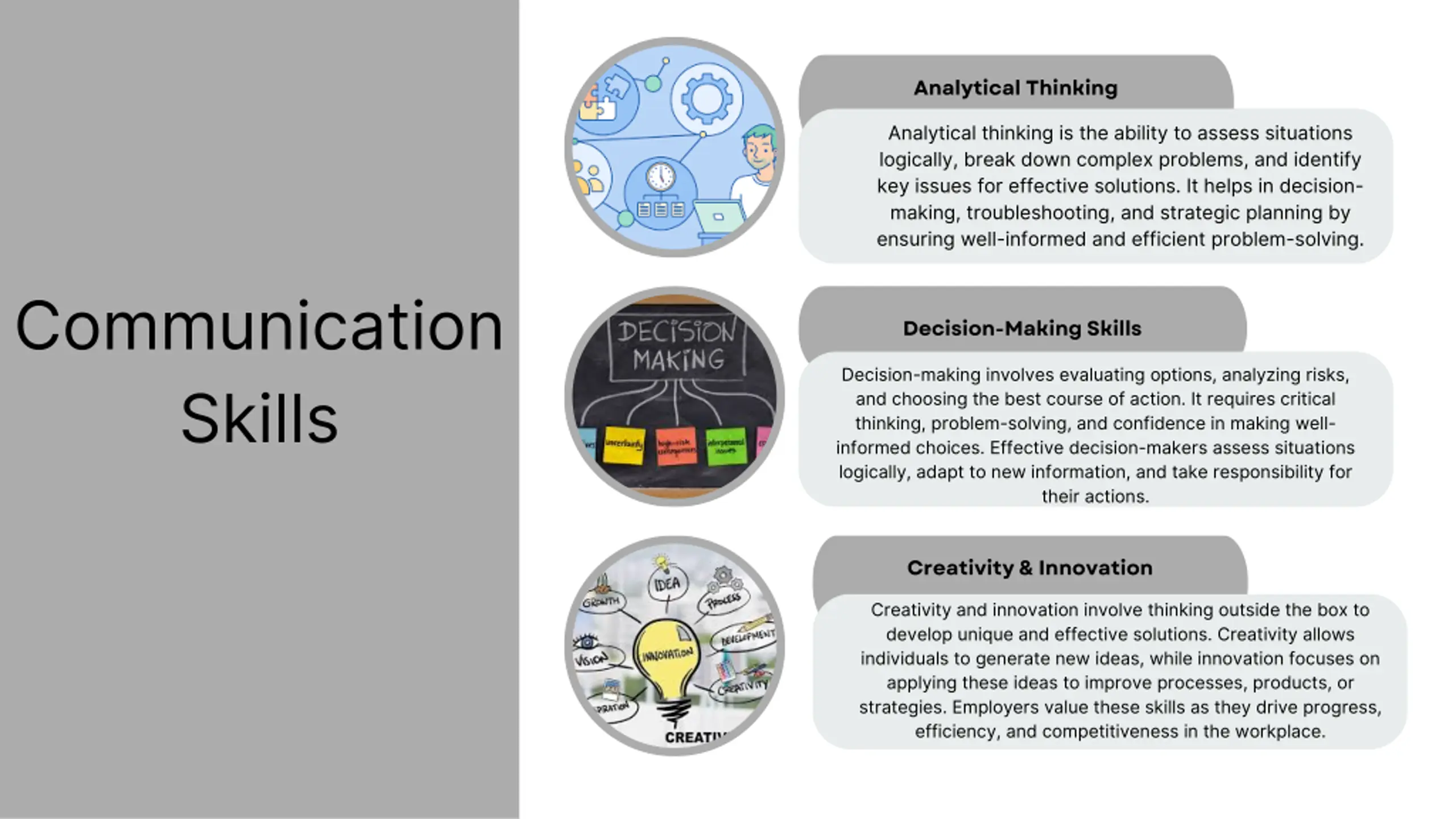 Analytical Thinking Analytical thinking is the ability to assess situations logically, break down complex problems, and identify key issues for effective solutions. It helps in decision- making, troubleshooting, and strategic planning by ensuring well-informed and efficient problem-solving. Communication Skills Decision-Making Skills Decision-making involves evaluating options, analyzing risks, and choosing the best course of action. It requires critical thinking, problem-solving, and confidence in making well- informed choices. Effective decision-makers assess situations logically, adapt to new information, and take responsibility for their actions. Creativity & Innovation Creativity and innovation involve thinking outside the box to develop unique and effective solutions. Creativity allows individuals to generate new ideas, while innovation focuses on applying these ideas to improve processes, products, or strategies. Employers value these skills as they drive progress, efficiency, and competitiveness in the workplace.