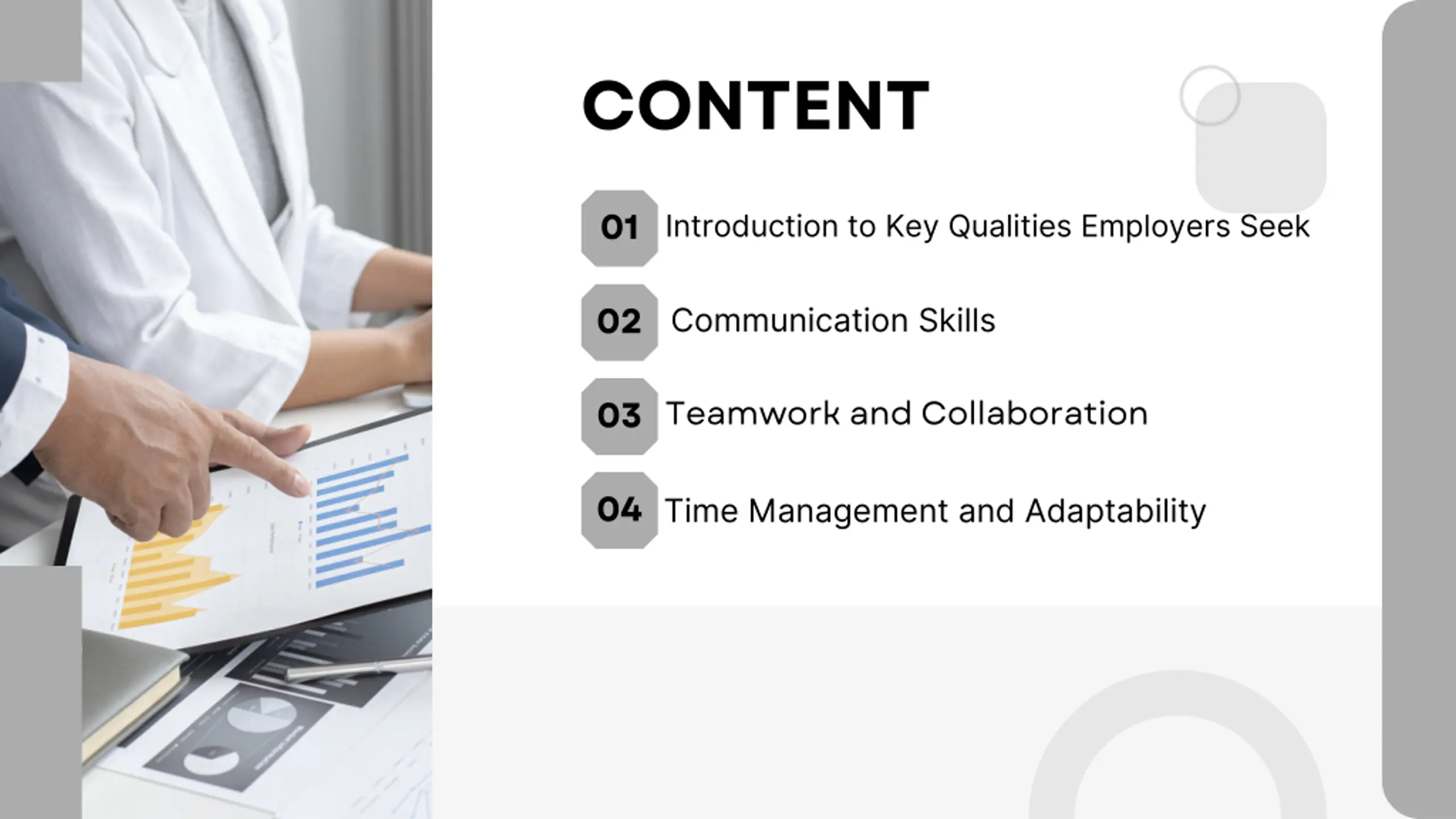 CONTENT 01 Introduction to Key Qualities Employers Seek 02 Communication Skills Teamwork and Collaboration 03 04 Time Management and Adaptability