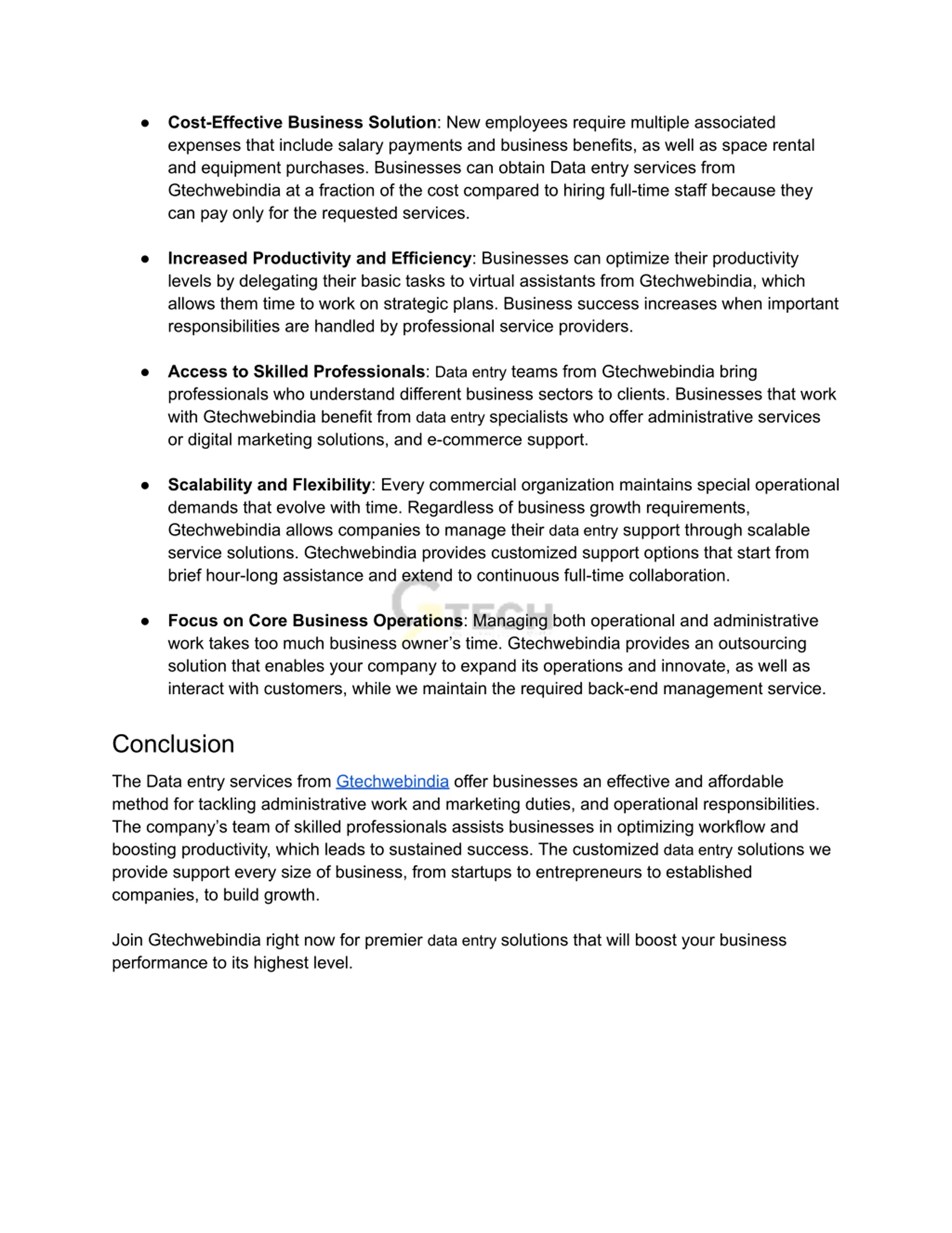 Cost-Effective Business Solution: New employees require multiple associated expenses that include salary payments and business benefits, as well as space rental and equipment purchases. Businesses can obtain Data entry services from Gtechwebindia at a fraction of the cost compared to hiring full-time staff because they can pay only for the requested services. Increased Productivity and Efficiency: Businesses can optimize their productivity levels by delegating their basic tasks to virtual assistants from Gtechwebindia, which allows them time to work on strategic plans. Business success increases when important responsibilities are handled by professional service providers. Access to Skilled Professionals: Data entry teams from Gtechwebindia bring professionals who understand different business sectors to clients. Businesses that work with Gtechwebindia benefit from data entry specialists who offer administrative services or digital marketing solutions, and e-commerce support. Scalability and Flexibility: Every commercial organization maintains special operational demands that evolve with time. Regardless of business growth requirements, Gtechwebindia allows companies to manage their data entry support through scalable service solutions. Gtechwebindia provides customized support options that start from brief hour-long assistance and extend to continuous full-time collaboration. Focus on Core Business Operations: Managing both operational and administrative work takes too much business owner s time. Gtechwebindia provides an outsourcing solution that enables your company to expand its operations and innovate, as well as interact with customers, while we maintain the required back-end management service. Conclusion The Data entry services from Gtechwebindia offer businesses an effective and affordable method for tackling administrative work and marketing duties, and operational responsibilities. The company s team of skilled professionals assists businesses in optimizing workflow and boosting productivity, which leads to sustained success. The customized data entry solutions we provide support every size of business, from startups to entrepreneurs to established companies, to build growth. Join Gtechwebindia right now for premier data entry solutions that will boost your business performance to its highest level.