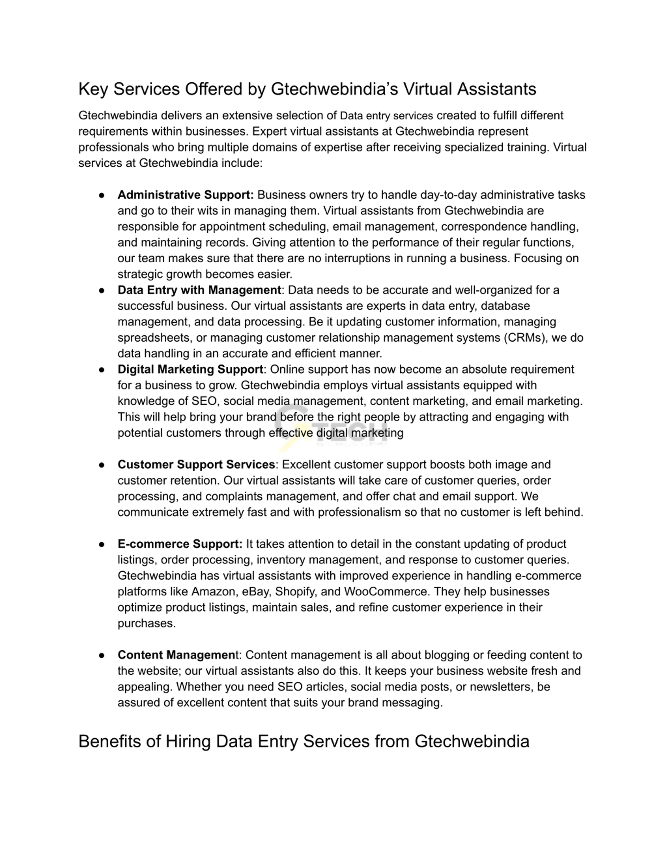 Key Services Offered by Gtechwebindias Virtual Assistants Gtechwebindia delivers an extensive selection of Data entry services created to fulfill different requirements within businesses. Expert virtual assistants at Gtechwebindia represent professionals who bring multiple domains of expertise after receiving specialized training. Virtual services at Gtechwebindia include: Administrative Support: Business owners try to handle day-to-day administrative tasks and go to their wits in managing them. Virtual assistants from Gtechwebindia are responsible for appointment scheduling, email management, correspondence handling, and maintaining records. Giving attention to the performance of their regular functions, our team makes sure that there are no interruptions in running a business. Focusing on strategic growth becomes easier. Data Entry with Management: Data needs to be accurate and well-organized for a successful business. Our virtual assistants are experts in data entry, database management, and data processing. Be it updating customer information, managing spreadsheets, or managing customer relationship management systems (CRMs), we do data handling in an accurate and efficient manner. Digital Marketing Support: Online support has now become an absolute requirement for a business to grow. Gtechwebindia employs virtual assistants equipped with knowledge of SEO, social media management, content marketing, and email marketing. This will help bring your brand before the right people by attracting and engaging with potential customers through effective digital marketing Customer Support Services: Excellent customer support boosts both image and customer retention. Our virtual assistants will take care of customer queries, order processing, and complaints management, and offer chat and email support. We communicate extremely fast and with professionalism so that no customer is left behind. E-commerce Support: It takes attention to detail in the constant updating of product listings, order processing, inventory management, and response to customer queries. Gtechwebindia has virtual assistants with improved experience in handling e-commerce platforms like Amazon, eBay, Shopify, and WooCommerce. They help businesses optimize product listings, maintain sales, and refine customer experience in their purchases. Content Management: Content management is all about blogging or feeding content to the website; our virtual assistants also do this. It keeps your business website fresh and appealing. Whether you need SEO articles, social media posts, or newsletters, be assured of excellent content that suits your brand messaging. Benefits of Hiring Data Entry Services from Gtechwebindia