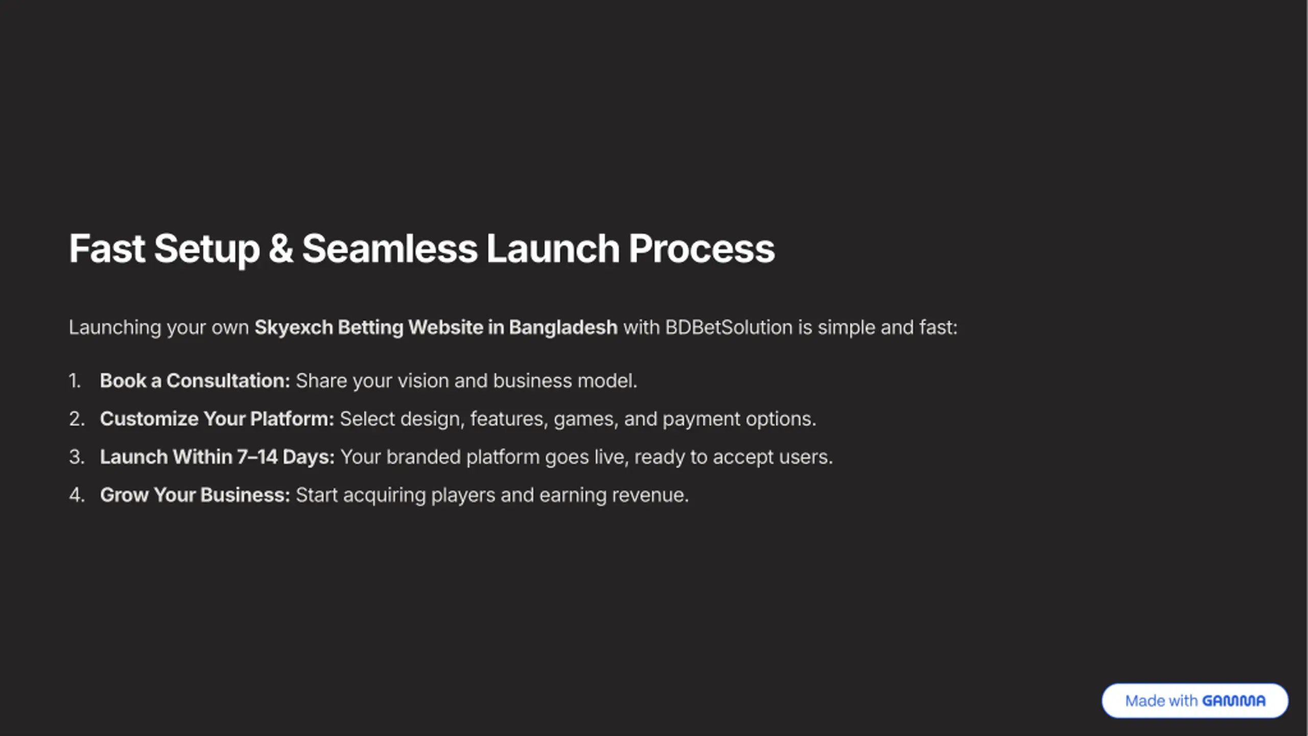 Fast Setup & Seamless Launch Process Launching your own Skyexch Betting Website in Bangladesh with BDBetSolution is simple and fast: 1. Book a Consultation: Share your vision and business model. 2. Customize Your Platform: Select design, features, games, and payment options. 3. Launch Within 7314 Days: Your branded platform goes live, ready to accept users. 4. Grow Your Business: Start acquiring players and earning revenue.