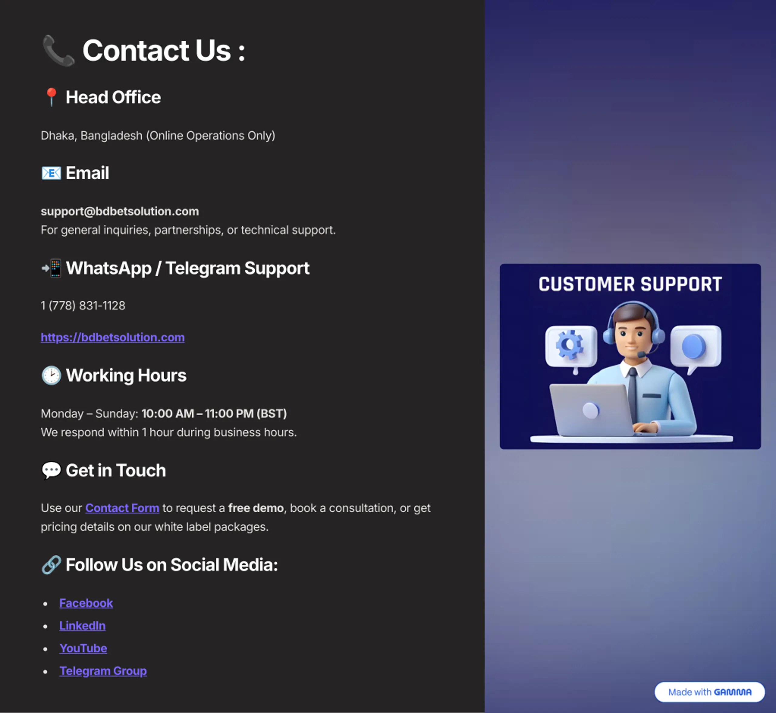 ? Contact Us : ? Head Office Dhaka, Bangladesh (Online Operations Only) ? Email support@bdbetsolution.com For general inquiries, partnerships, or technical support. ? WhatsApp / Telegram Support 1 (778) 831-1128 https://bdbetsolution.com ? Working Hours Monday 3 Sunday: 10:00 AM 3 11:00 PM (BST) We respond within 1 hour during business hours. Get in Touch ? Use our Contact Form to request a free demo, book a consultation, or get pricing details on our white label packages. ? Follow Us on Social Media: Facebook LinkedIn YouTube Telegram Group