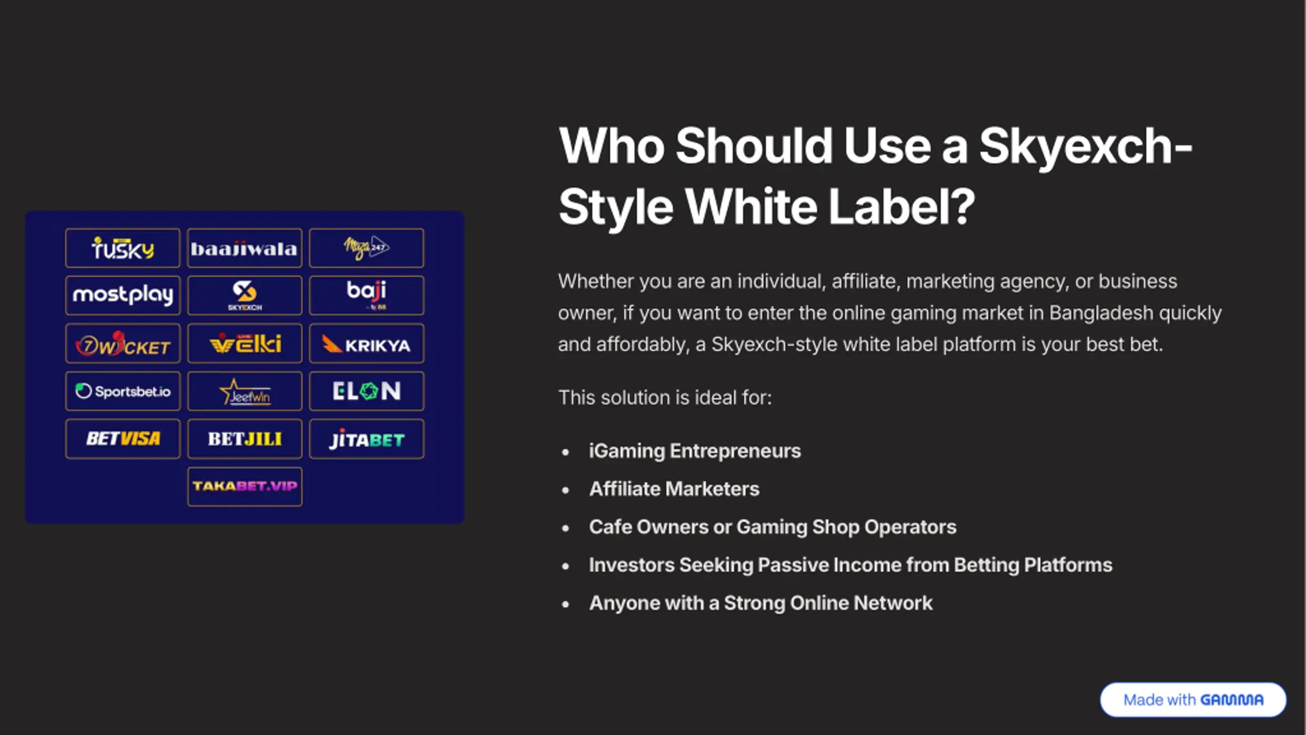 Who Should Use a Skyexch- Style White Label? Whether you are an individual, affiliate, marketing agency, or business owner, if you want to enter the online gaming market in Bangladesh quickly and affordably, a Skyexch-style white label platform is your best bet. This solution is ideal for: iGaming Entrepreneurs Affiliate Marketers Cafe Owners or Gaming Shop Operators Investors Seeking Passive Income from Betting Platforms Anyone with a Strong Online Network