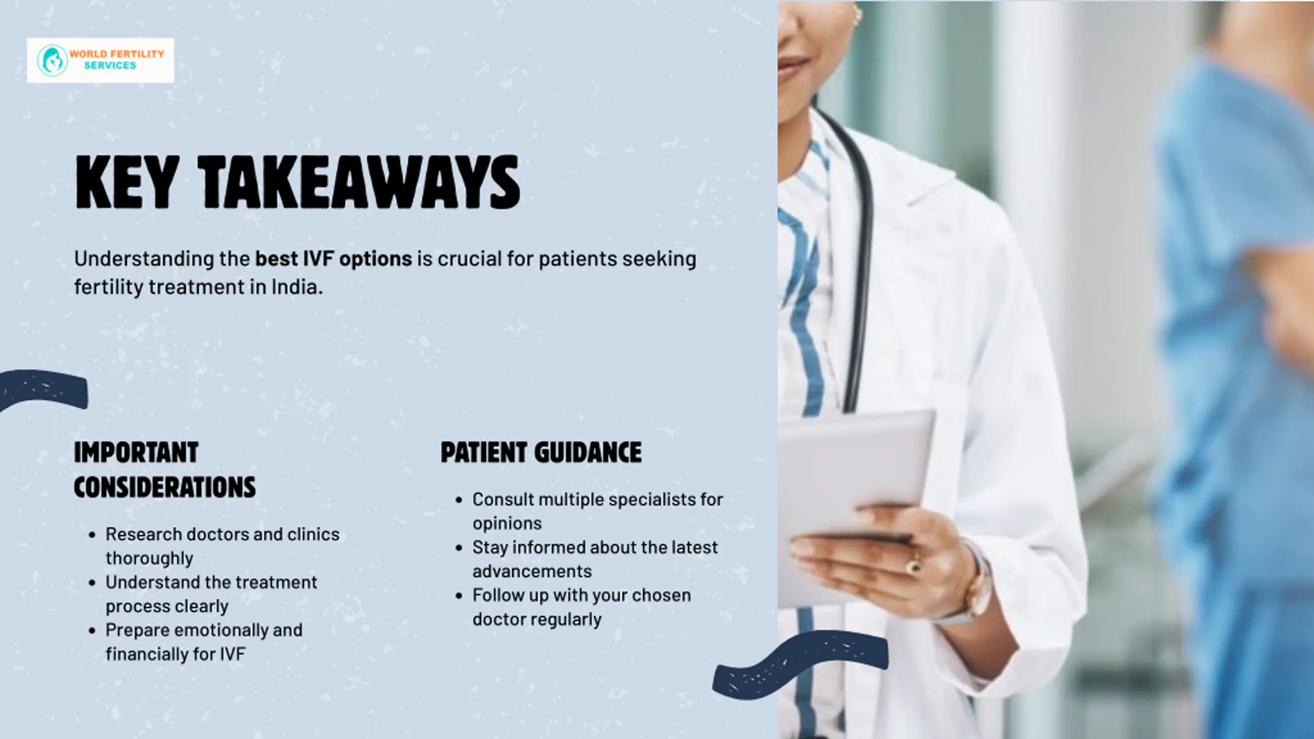 KEY TAKEAWAYS Understanding the best IVF options is crucial for patients seeking fertility treatment in India. IMPORTANT CONSIDERATIONS PATIENT GUIDANCE Consult multiple specialists for opinions Stay informed about the latest advancements Follow up with your chosen doctor regularly Research doctors and clinics thoroughly Understand the treatment process clearly Prepare emotionally and financially for IVF