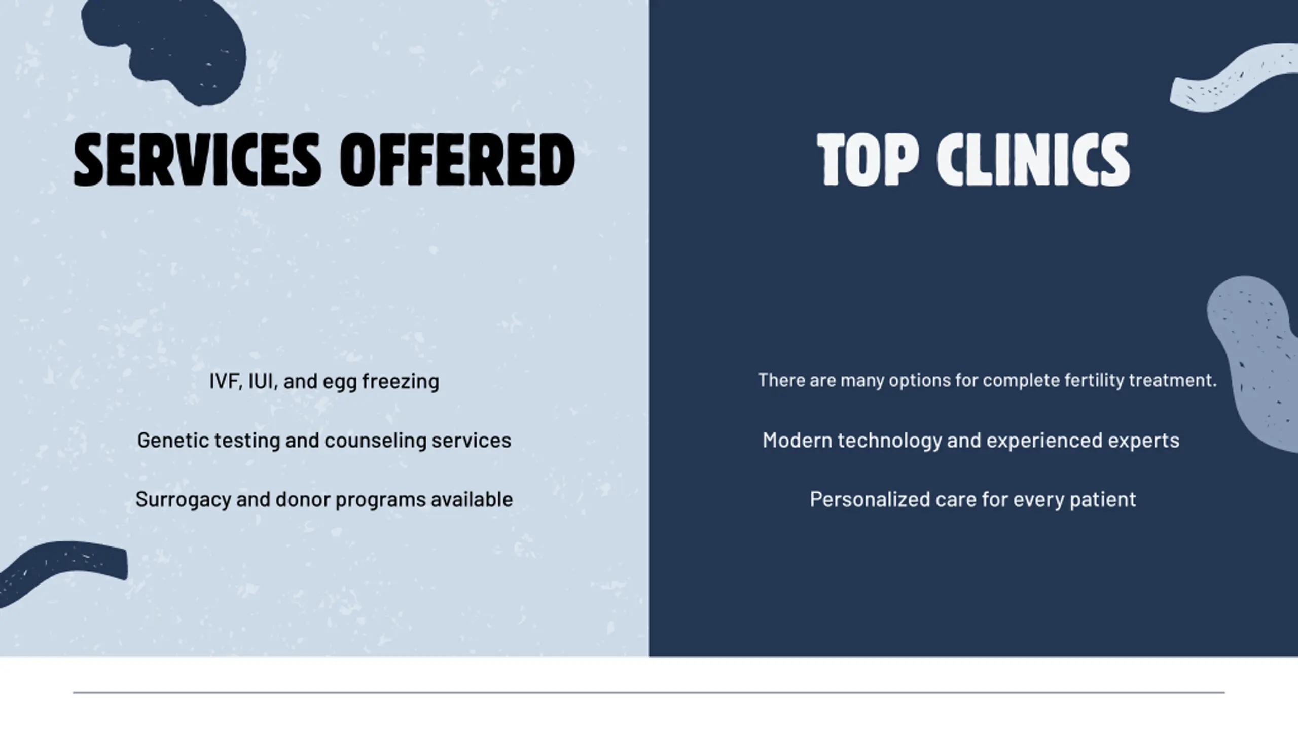 SERVICES OFFERED TOP CLINICS IVF, IUI, and egg freezing There are many options for complete fertility treatment. Modern technology and experienced experts Genetic testing and counseling services Personalized care for every patient Surrogacy and donor programs available