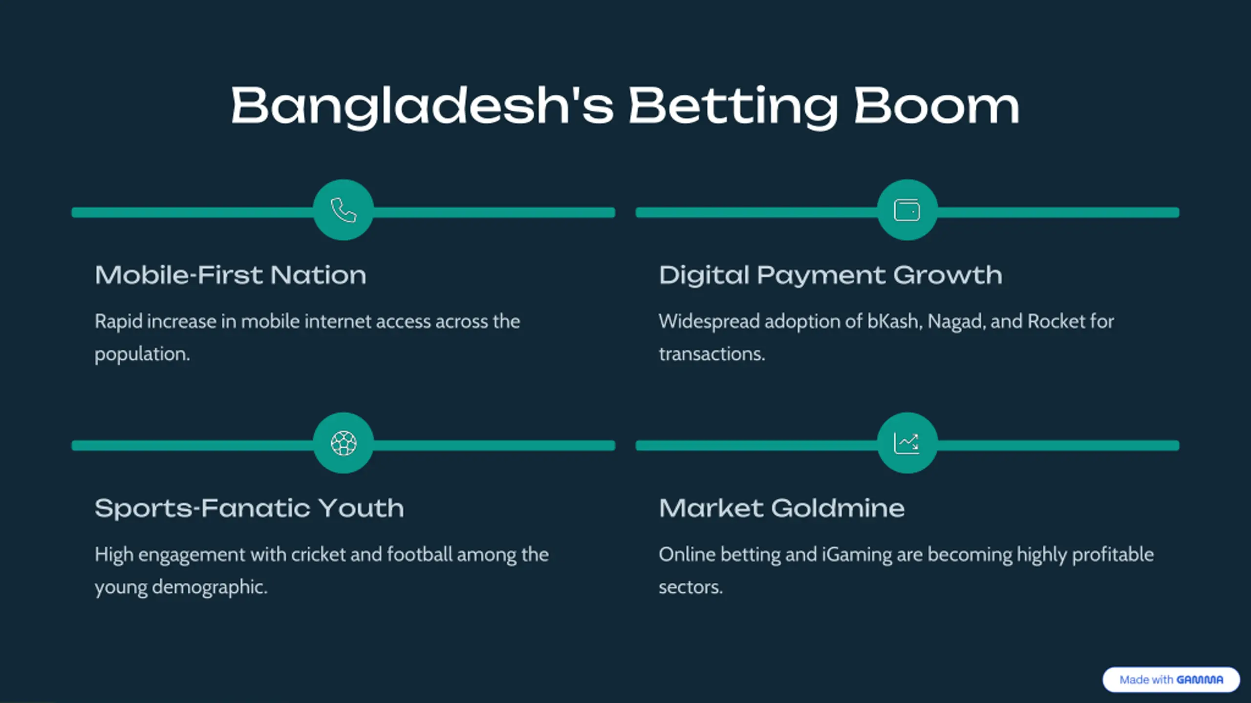 Bangladesh's Betting Boom Mobile-First Nation Digital Payment Growth Rapid increase in mobile internet access across the population. Widespread adoption of bKash, Nagad, and Rocket for transactions. Sports-Fanatic Youth Market Goldmine High engagement with cricket and football among the young demographic. Online betting and iGaming are becoming highly profitable sectors. preencoded.png