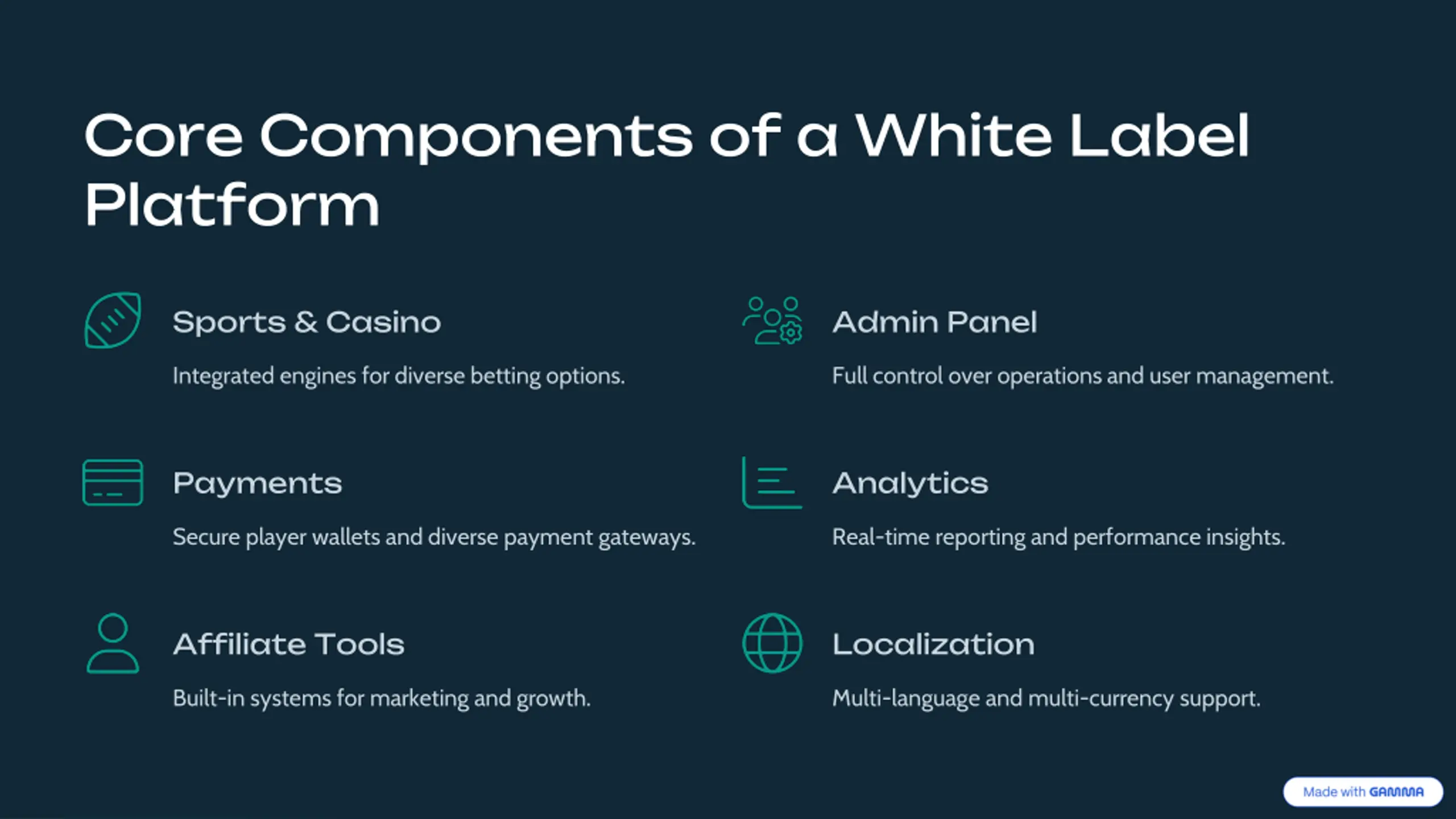 Core Components of a White Label Platform Sports & Casino Admin Panel Integrated engines for diverse betting options. Full control over operations and user management. Payments Analytics Secure player wallets and diverse payment gateways. Real-time reporting and performance insights. Affiliate Tools Localization Built-in systems for marketing and growth. Multi-language and multi-currency support. preencoded.png