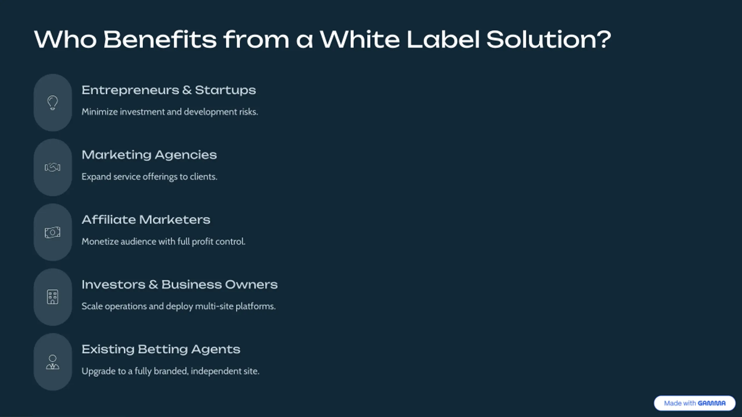 Who Benefits from a White Label Solution? Entrepreneurs & Startups Minimize investment and development risks. Marketing Agencies Expand service offerings to clients. Affiliate Marketers Monetize audience with full profit control. Investors & Business Owners Scale operations and deploy multi-site platforms. Existing Betting Agents Upgrade to a fully branded, independent site. preencoded.png