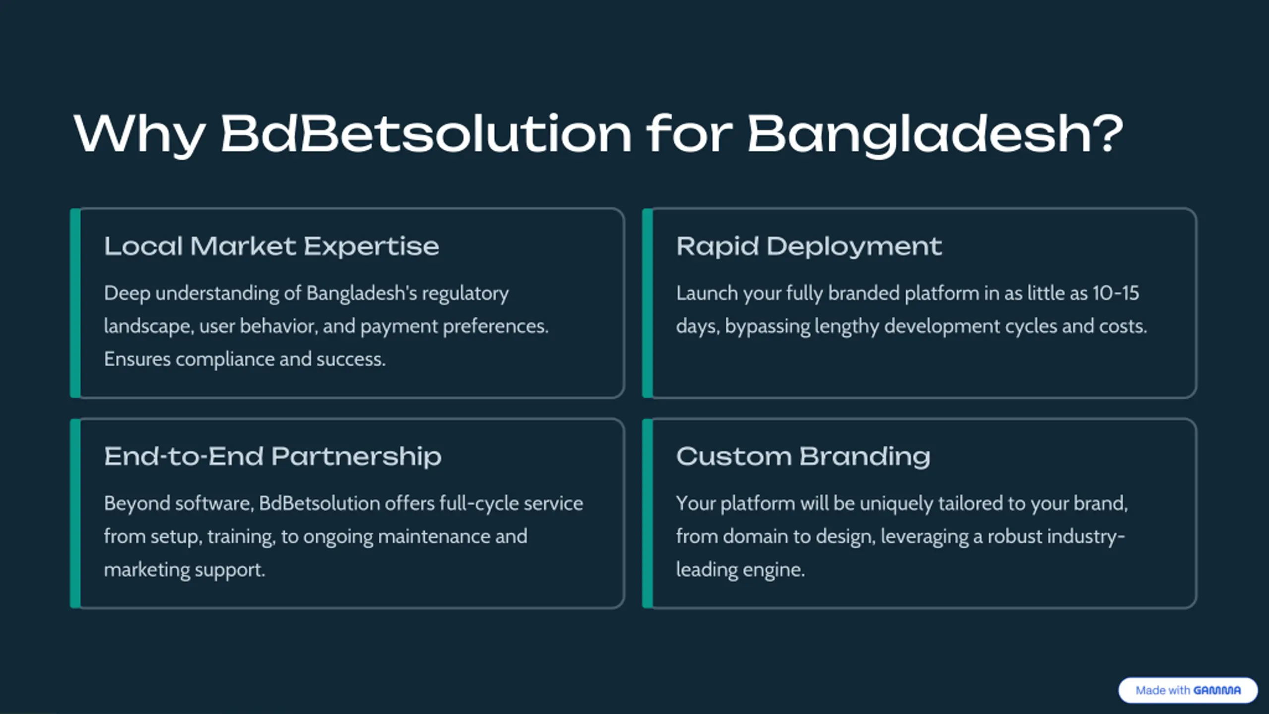 Why BdBetsolution for Bangladesh? Local Market Expertise Rapid Deployment Deep understanding of Bangladesh's regulatory landscape, user behavior, and payment preferences. Ensures compliance and success. Launch your fully branded platform in as little as 10-15 days, bypassing lengthy development cycles and costs. End-to-End Partnership Custom Branding Beyond software, BdBetsolution offers full-cycle service from setup, training, to ongoing maintenance and marketing support. Your platform will be uniquely tailored to your brand, from domain to design, leveraging a robust industry- leading engine. preencoded.png