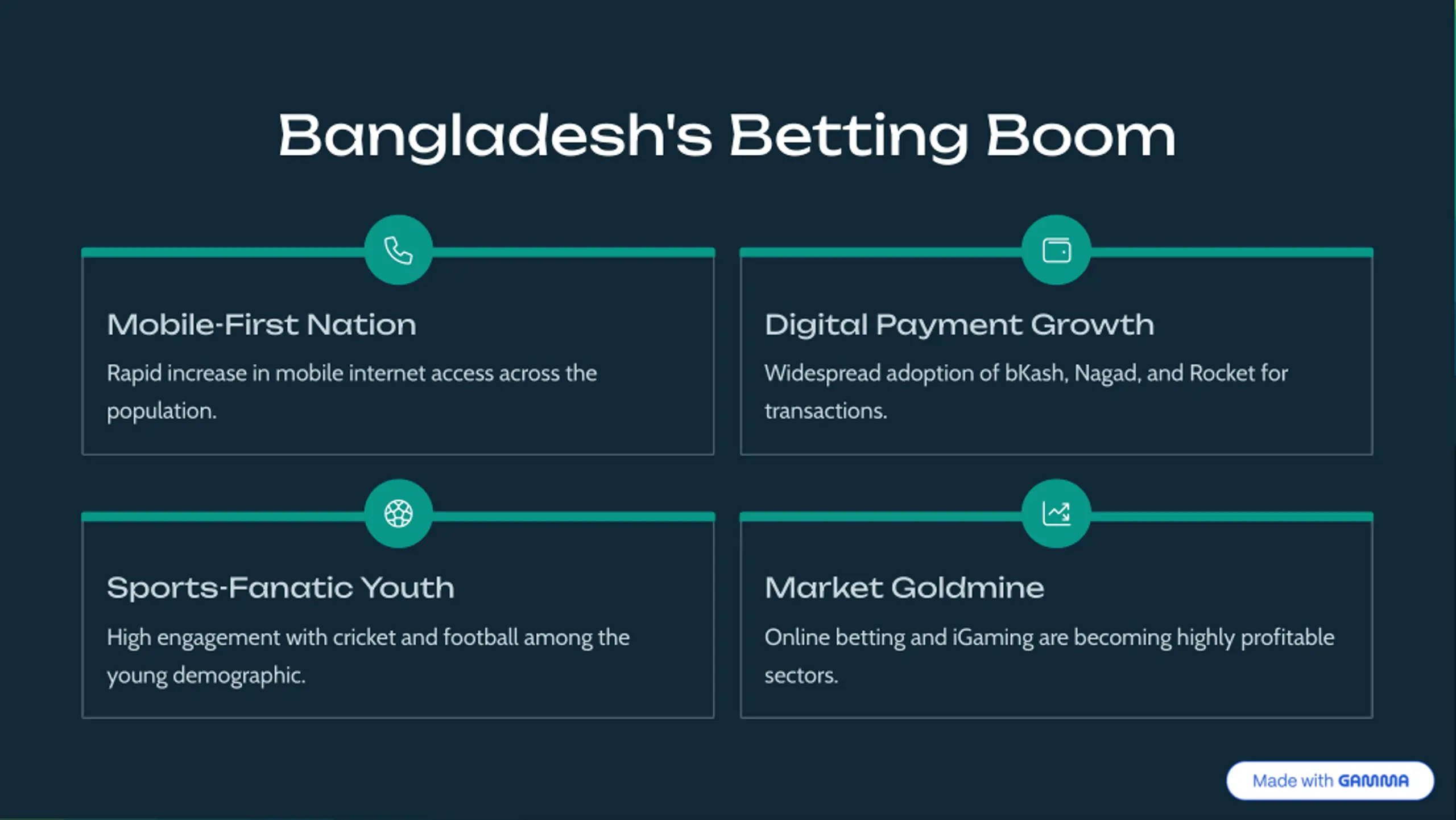 Bangladesh's Betting Boom Mobile-First Nation Digital Payment Growth Rapid increase in mobile internet access across the population. Widespread adoption of bKash, Nagad, and Rocket for transactions. Sports-Fanatic Youth Market Goldmine High engagement with cricket and football among the young demographic. Online betting and iGaming are becoming highly profitable sectors.