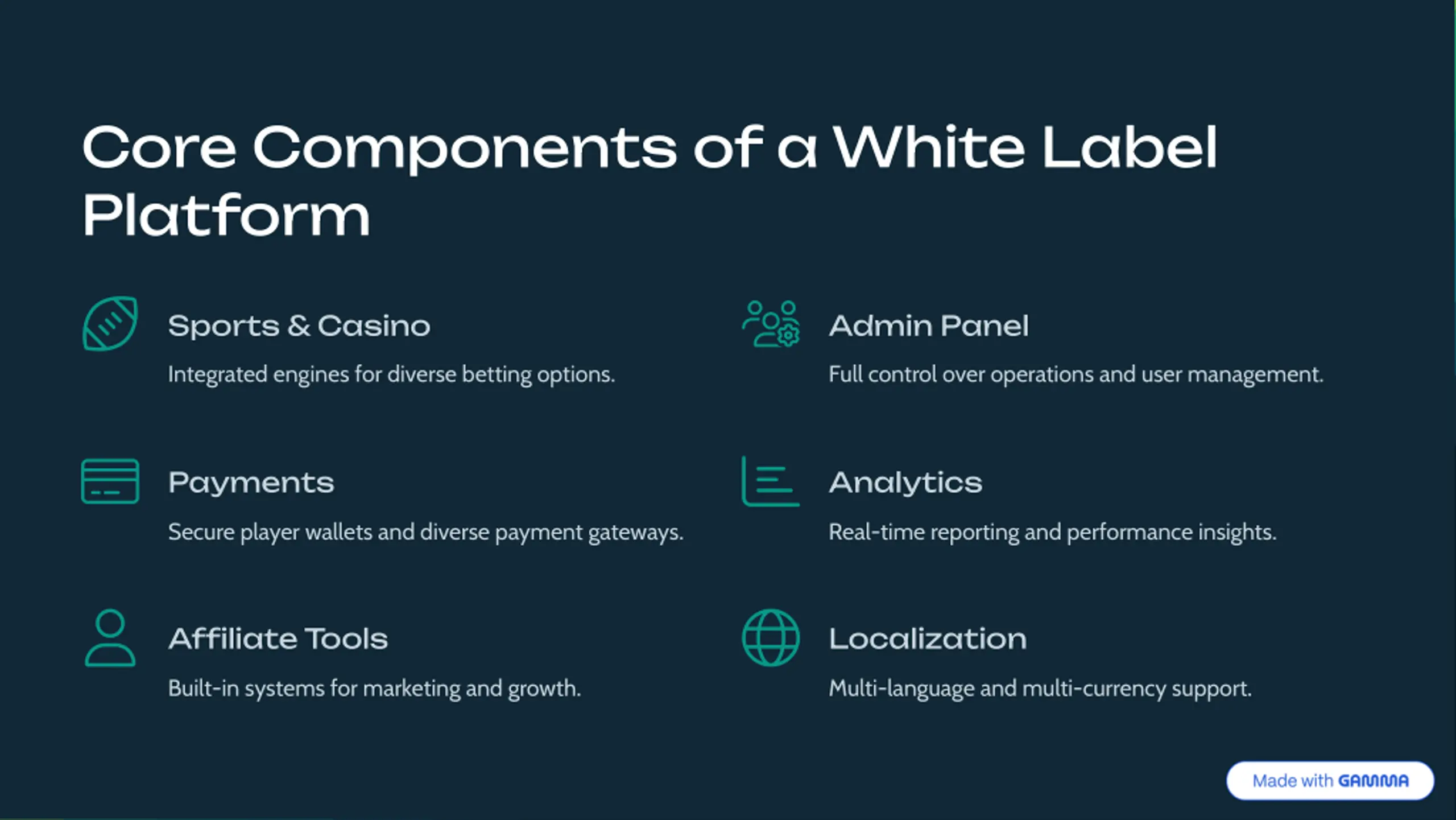 Core Components of a White Label Platform Sports & Casino Admin Panel Integrated engines for diverse betting options. Full control over operations and user management. Payments Analytics Secure player wallets and diverse payment gateways. Real-time reporting and performance insights. Affiliate Tools Localization Built-in systems for marketing and growth. Multi-language and multi-currency support.