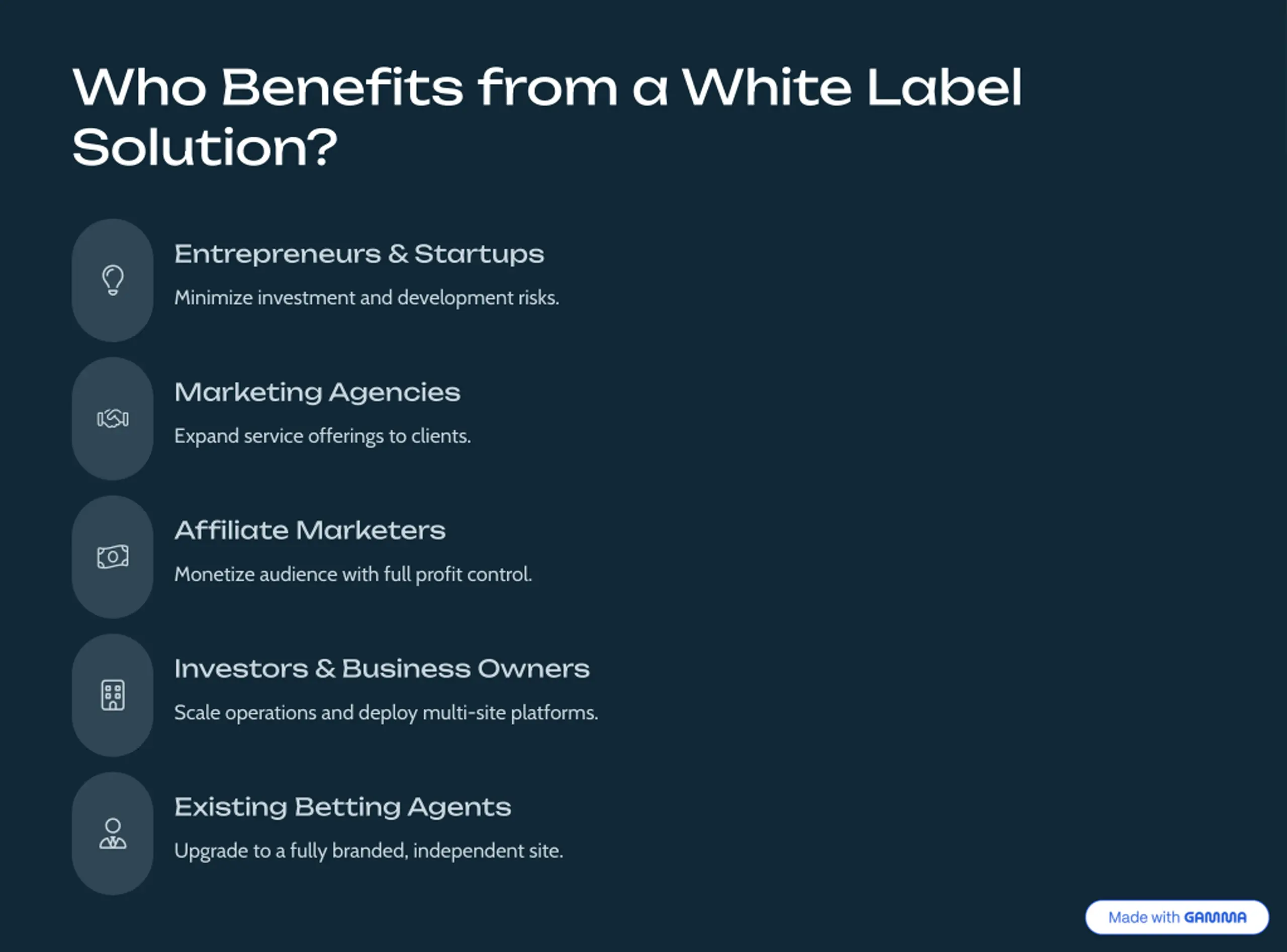 Who Benefits from a White Label Solution? Entrepreneurs & Startups Minimize investment and development risks. Marketing Agencies Expand service offerings to clients. Affiliate Marketers Monetize audience with full profit control. Investors & Business Owners Scale operations and deploy multi-site platforms. Existing Betting Agents Upgrade to a fully branded, independent site.