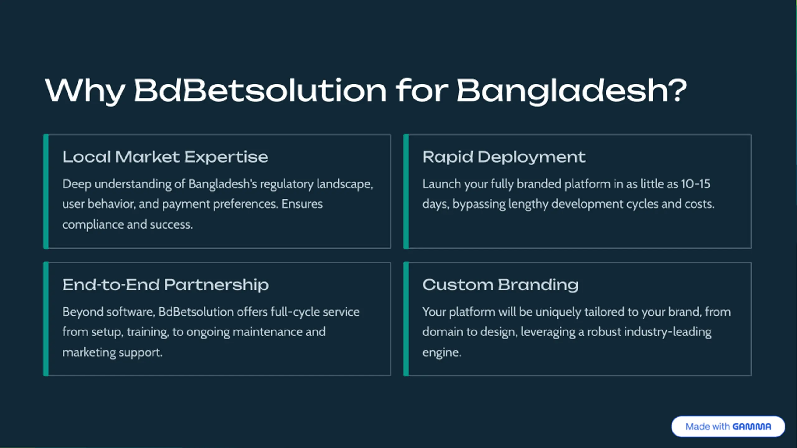 Why BdBetsolution for Bangladesh? Local Market Expertise Rapid Deployment Deep understanding of Bangladesh's regulatory landscape, user behavior, and payment preferences. Ensures compliance and success. Launch your fully branded platform in as little as 10-15 days, bypassing lengthy development cycles and costs. End-to-End Partnership Custom Branding Beyond software, BdBetsolution offers full-cycle service from setup, training, to ongoing maintenance and marketing support. Your platform will be uniquely tailored to your brand, from domain to design, leveraging a robust industry-leading engine.