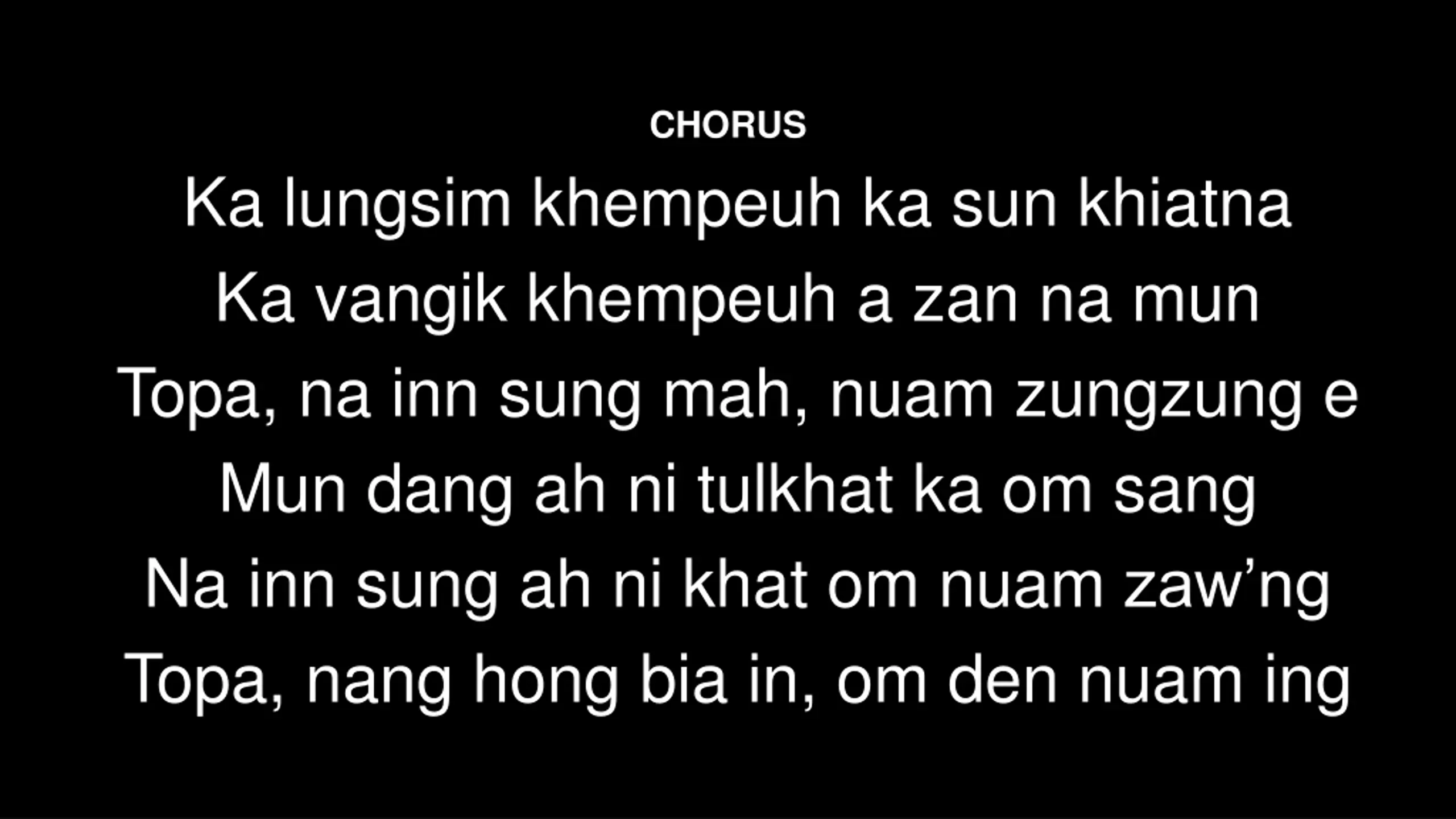 CHORUS Ka lungsim khempeuh ka sun khiatna Ka vangik khempeuh a zan na mun Topa, na inn sung mah, nuam zungzung e Mun dang ah ni tulkhat ka om sang Na inn sung ah ni khat om nuam zaw ng Topa, nang hong bia in, om den nuam ing