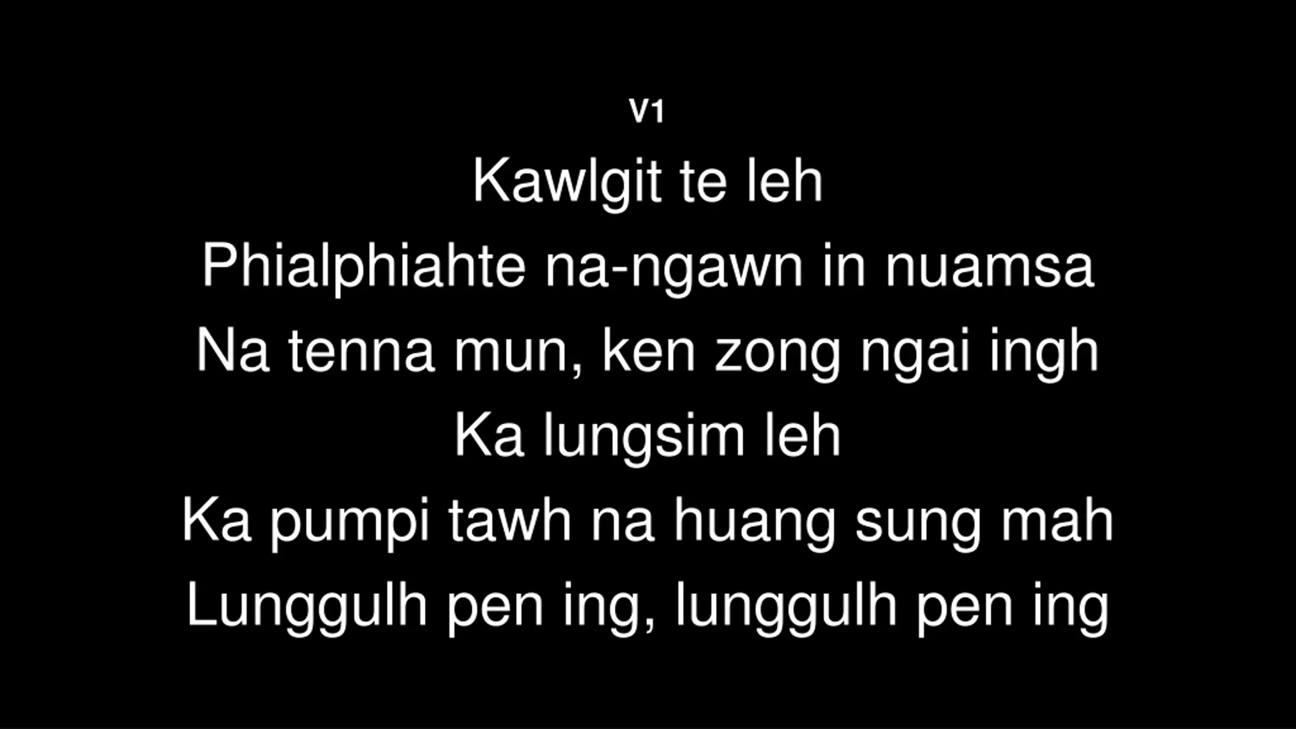V1 Kawlgit te leh Phialphiahte na-ngawn in nuamsa Na tenna mun, ken zong ngai ingh Ka lungsim leh Ka pumpi tawh na huang sung mah Lunggulh pen ing, lunggulh pen ing