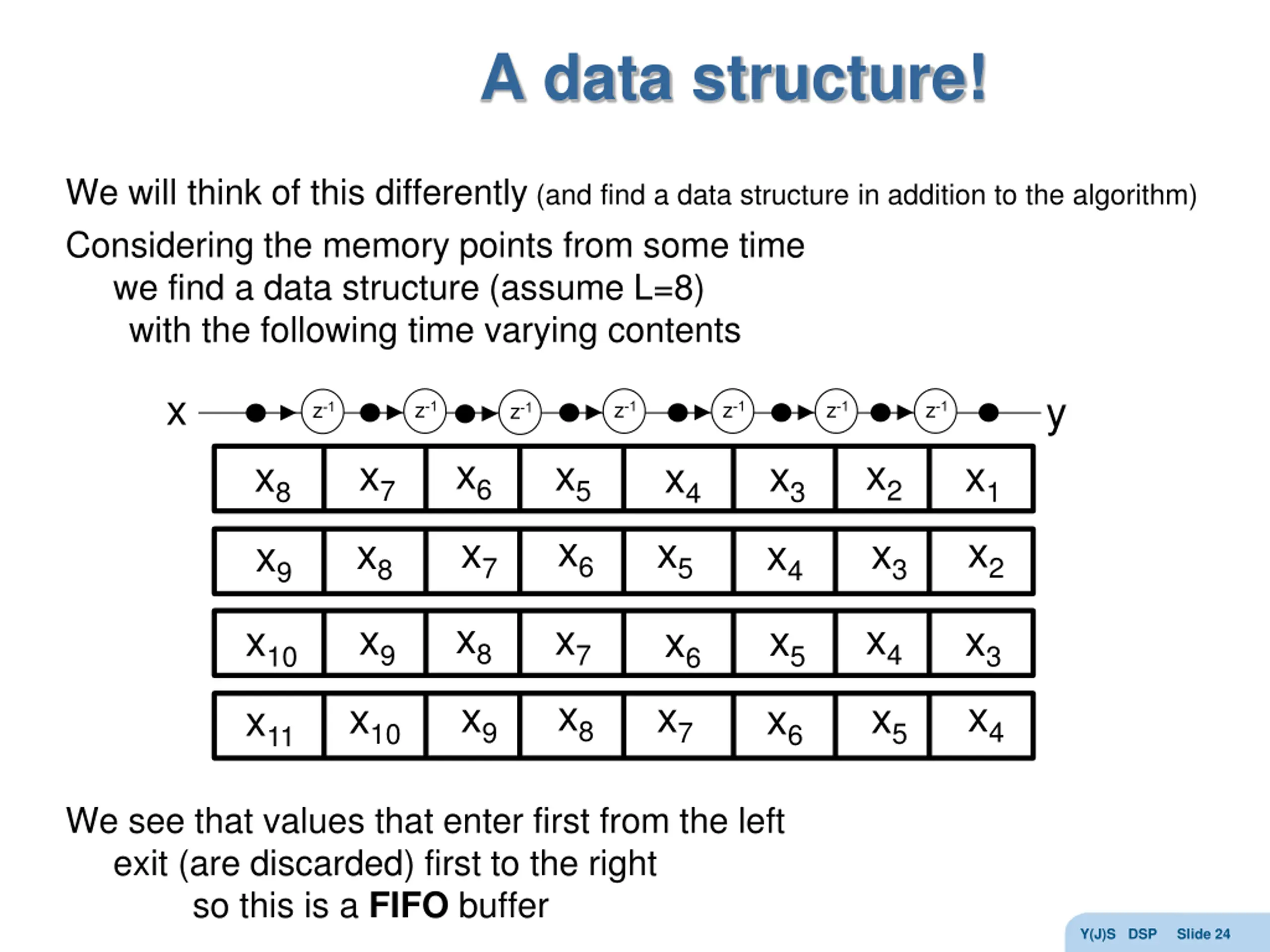 A data structure! We will think of this differently (and find a data structure in addition to the algorithm) Considering the memory points from some time we find a data structure (assume L=8) with the following time varying contents x y z-1 z-1 z-1 z-1 z-1 z-1 z-1 x6 x2 x7 x5 x6 x3 x1 x2 x8 x4 x5 x7 x3 x8 x4 x9 x8 x4 x9 x7 x8 x5 x3 x4 x10 x6 x7 x9 x5 x10 x6 x11 We see that values that enter first from the left exit (are discarded) first to the right so this is a FIFO buffer Y(J)S DSP Slide 24