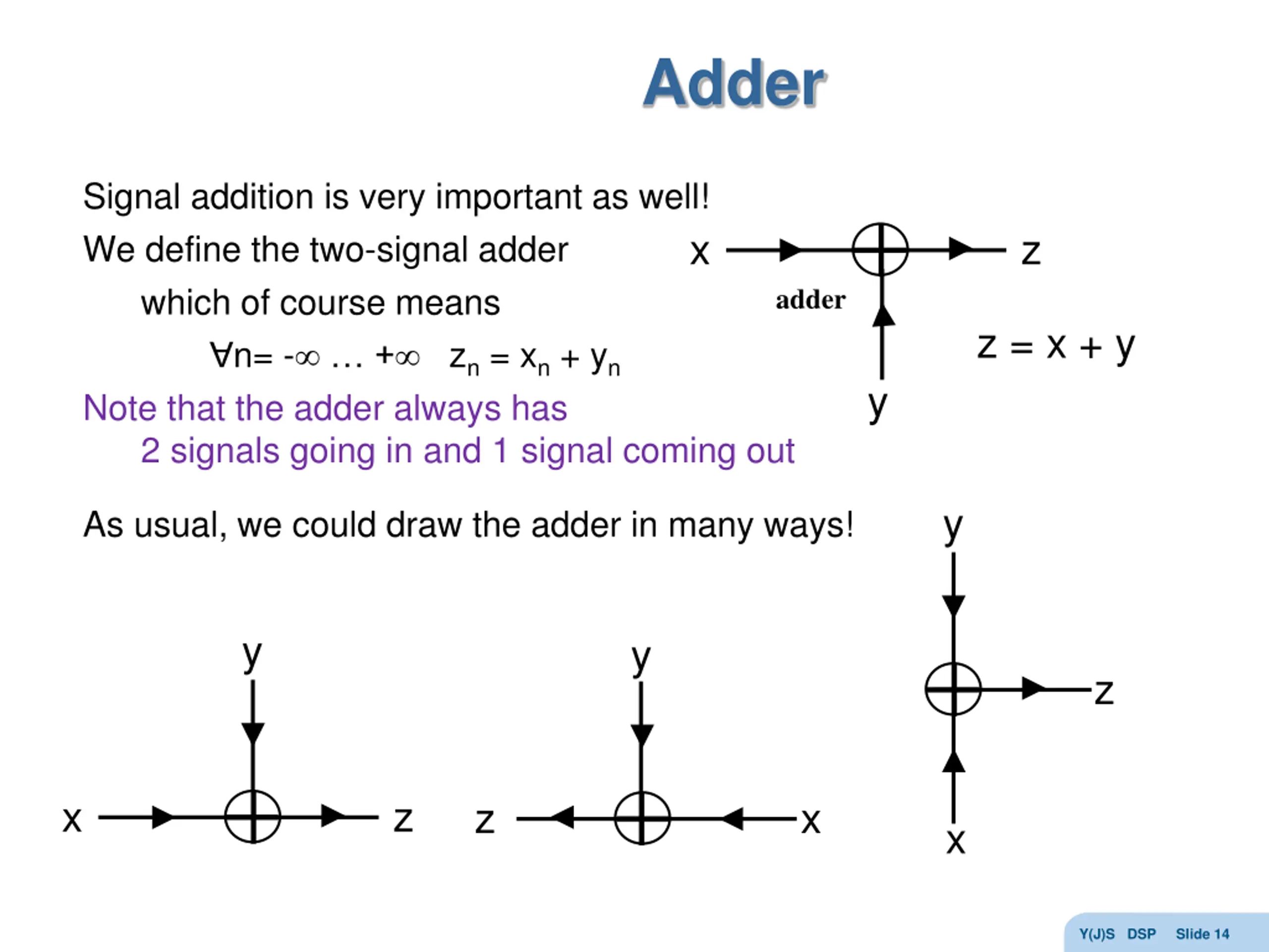 Adder Signal addition is very important as well! We define the two-signal adder which of course means n= - + zn = xn + yn Note that the adder always has 2 signals going in and 1 signal coming out x z adder z = x + y y y As usual, we could draw the adder in many ways! y y z x z z x x Y(J)S DSP Slide 14