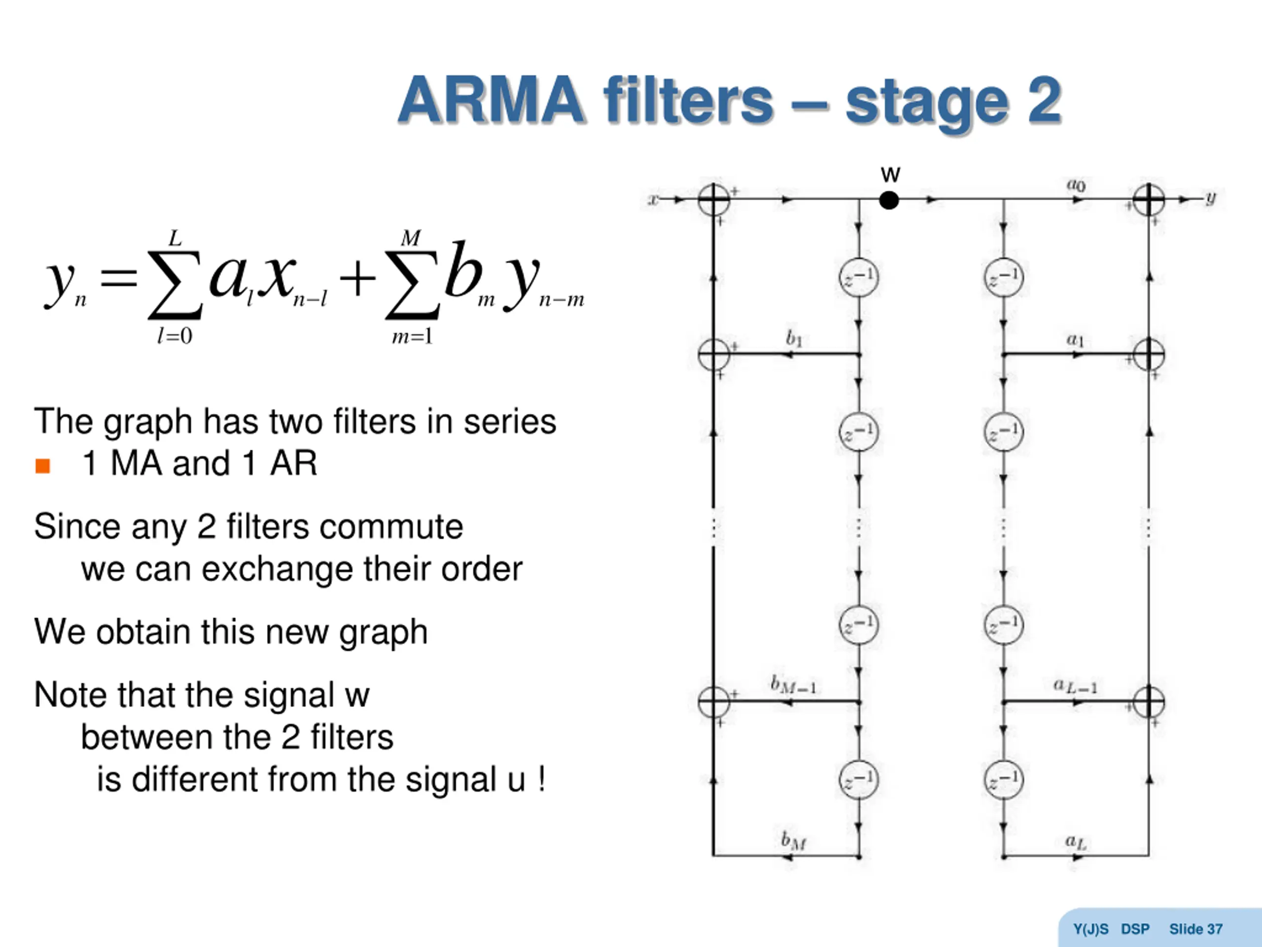 ARMA filters stage 2 w a x b y L M = + l = l = m y n l n m n m 0 1 The graph has two filters in series 1 MA and 1 AR Since any 2 filters commute we can exchange their order We obtain this new graph Note that the signal w between the 2 filters is different from the signal u ! Y(J)S DSP Slide 37