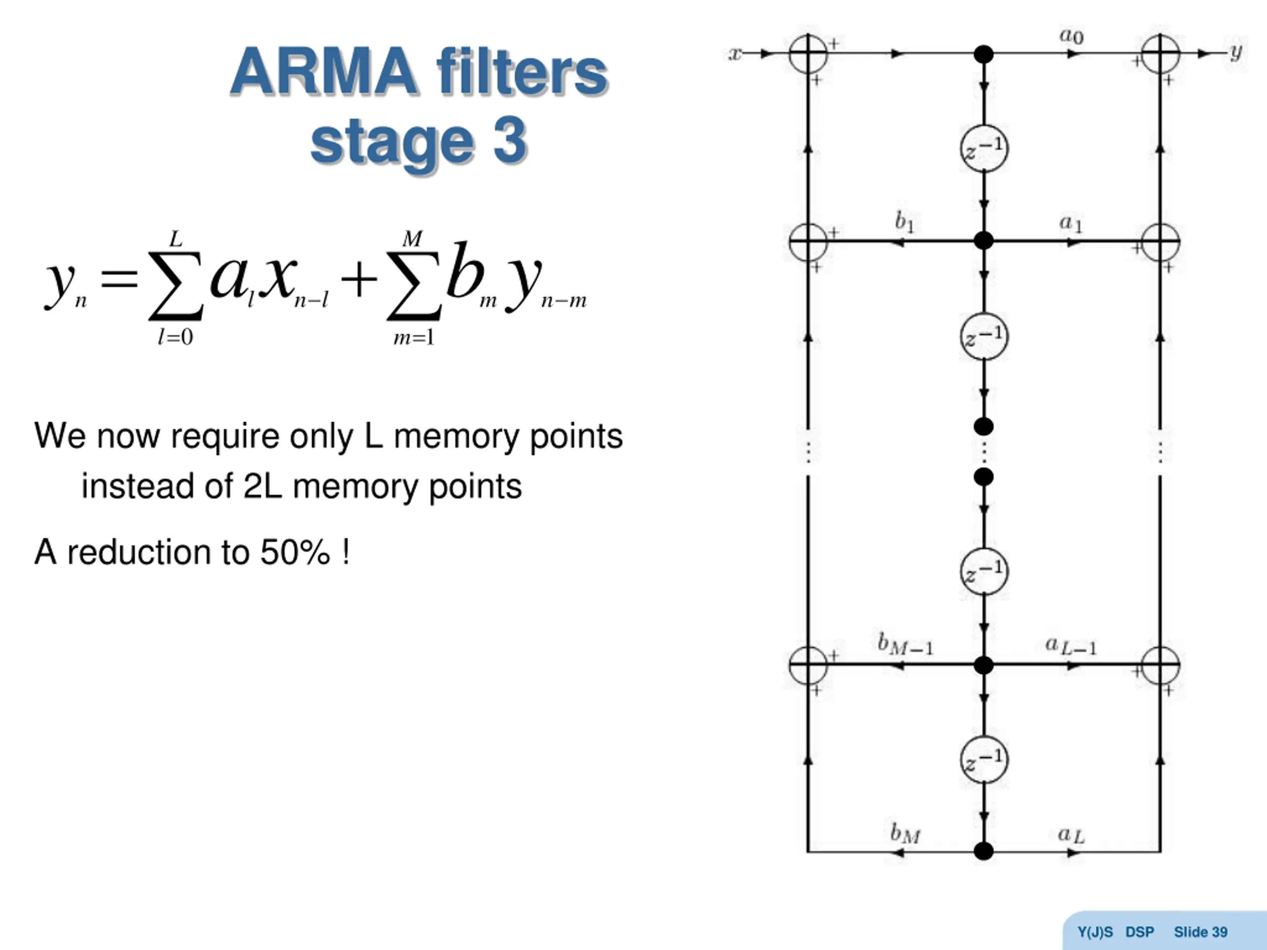 ARMA filters stage 3 wn a x b y L M = + l = l = m y n l n m n m wn-1 0 1 We see that there are points representing the same signal ! wn-2 All of these are So we can combine the memory locations and remove un-needed delays This is a new graph transformation Y(J)S DSP Slide 38
