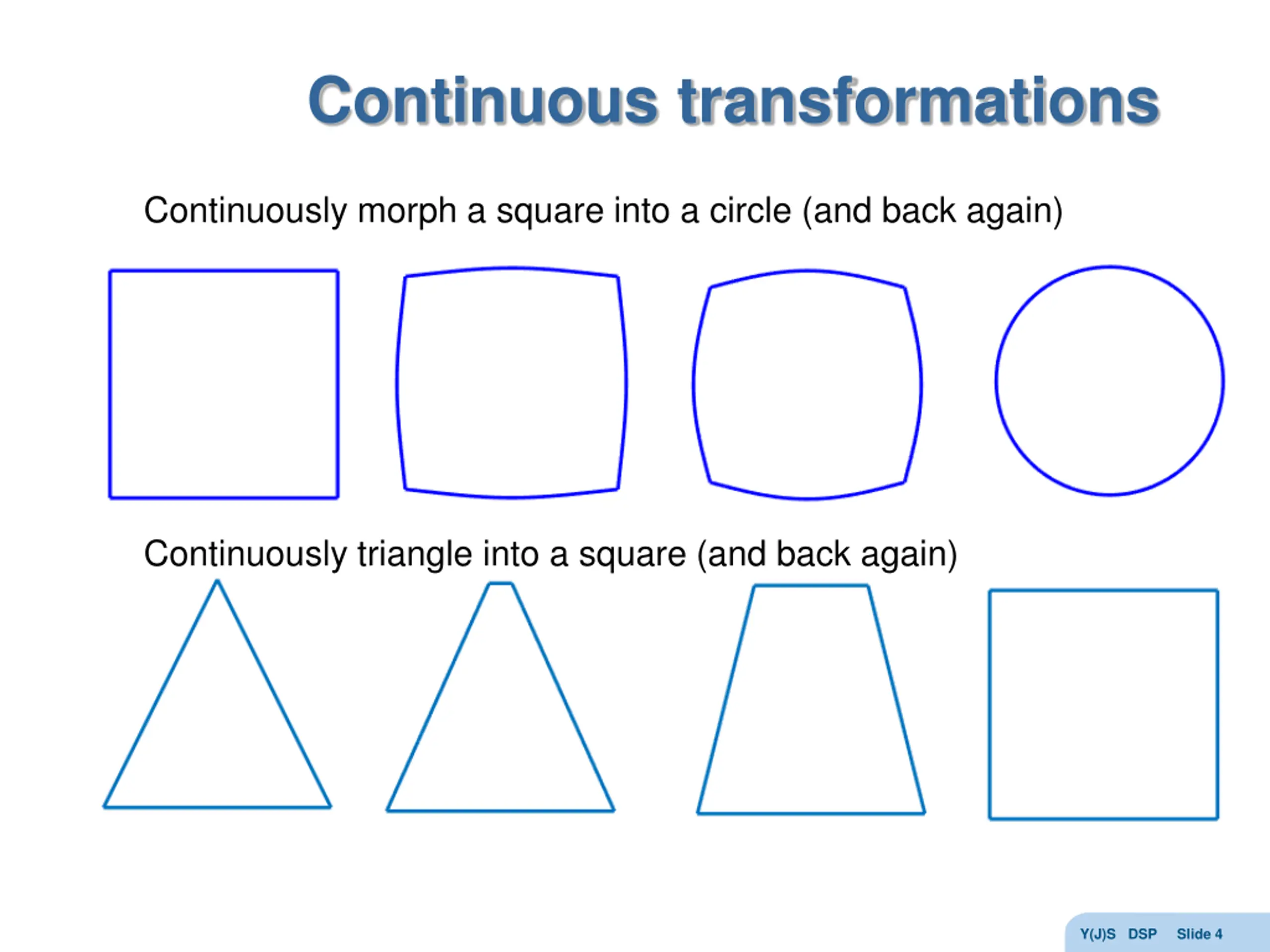 Continuous transformations Continuously morph a square into a circle (and back again) Continuously triangle into a square (and back again) Y(J)S DSP Slide 4