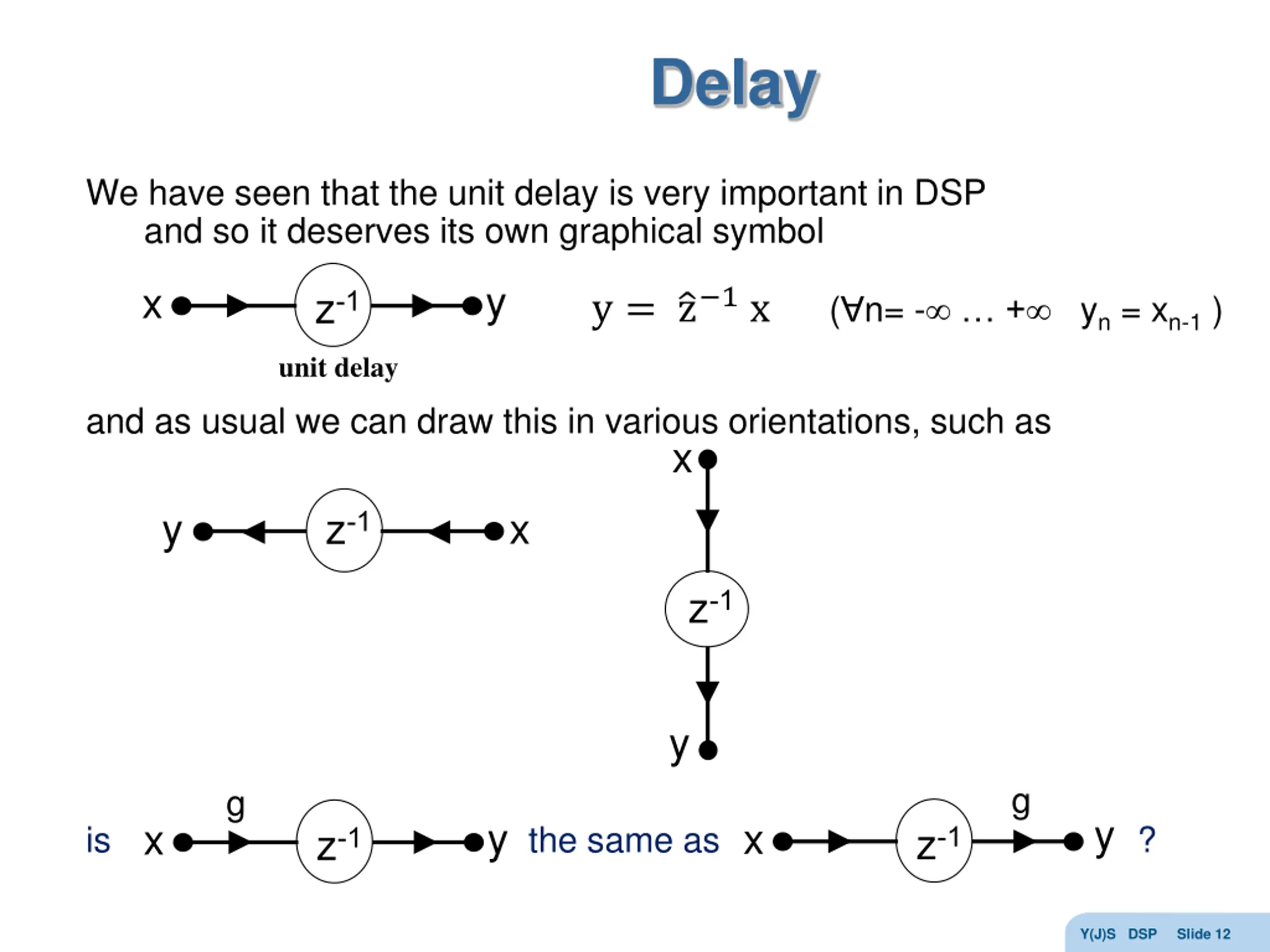 Delay We have seen that the unit delay is very important in DSP and so it deserves its own graphical symbol y x z-1 y = z 1 x( n= - + yn = xn-1 ) unit delay and as usual we can draw this in various orientations, such as x z-1 y x z-1 y g g y is the same as ? x y z-1 x z-1 Y(J)S DSP Slide 12