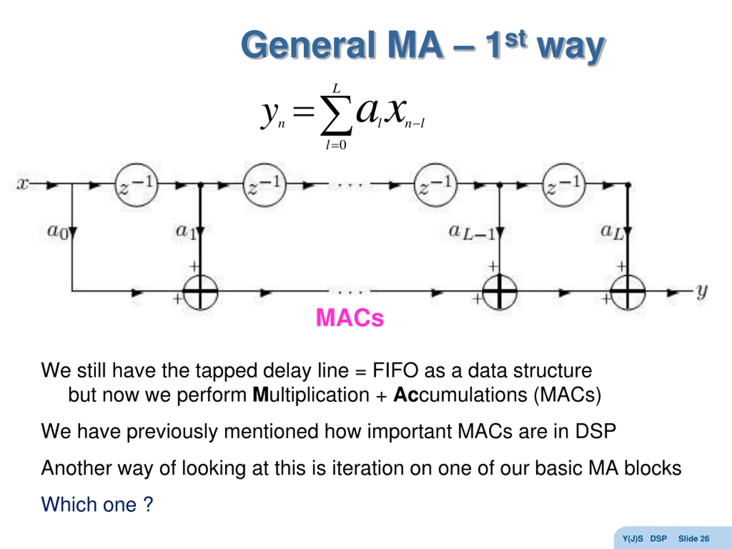 General MA 1st way = l 0 a x L = y n l n l MACs We still have the tapped delay line = FIFO as a data structure but now we perform Multiplication + Accumulations (MACs) We have previously mentioned how important MACs are in DSP Another way of looking at this is iteration on one of our basic MA blocks Which one ? Y(J)S DSP Slide 26