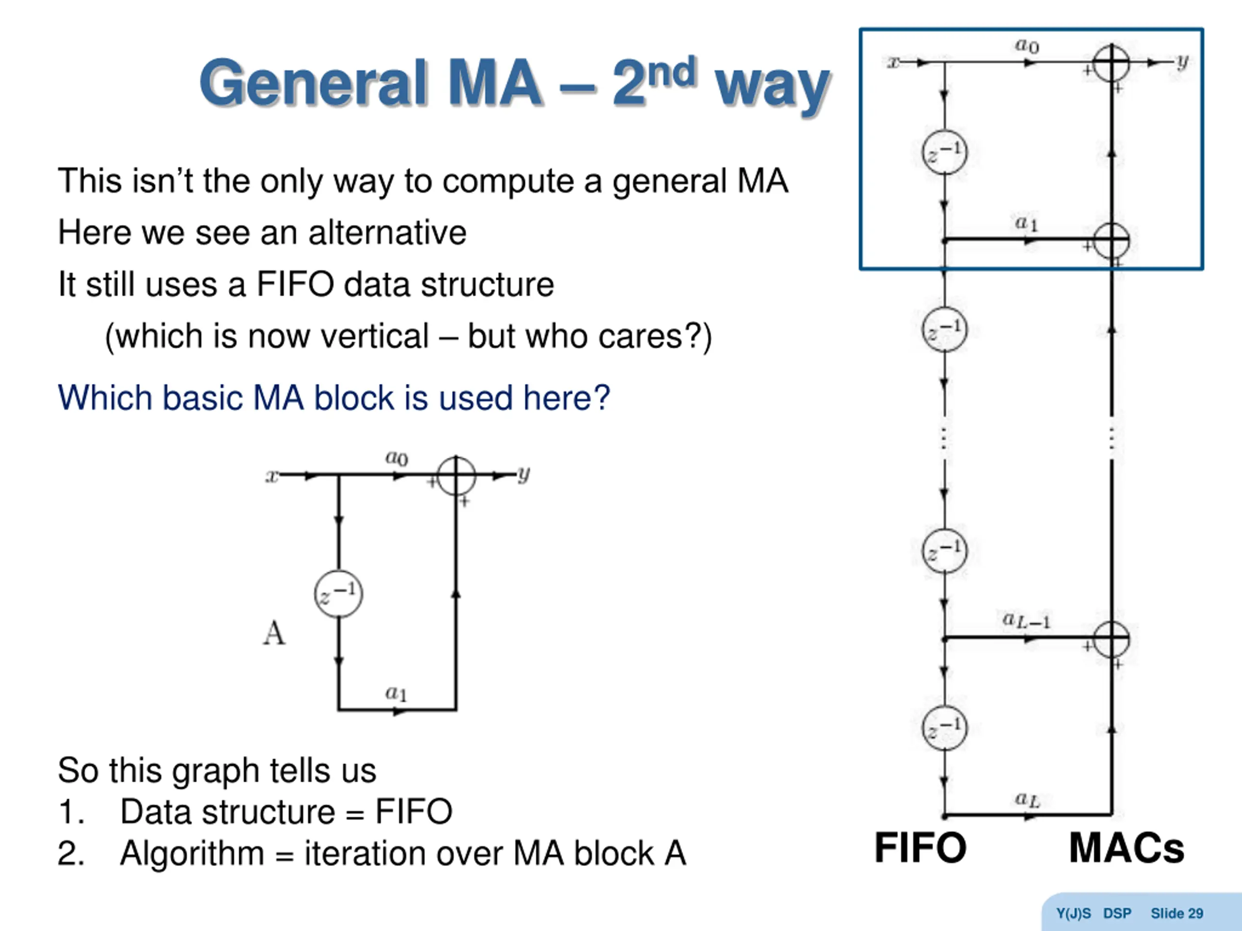 General MA 2nd way This isn t the only way to compute a general MA Here we see an alternative It still uses a FIFO data structure (which is now vertical but who cares?) Which basic MA block is used here? So this graph tells us 1. Data structure = FIFO 2. Algorithm = iteration over MA block A FIFO MACs Y(J)S DSP Slide 29