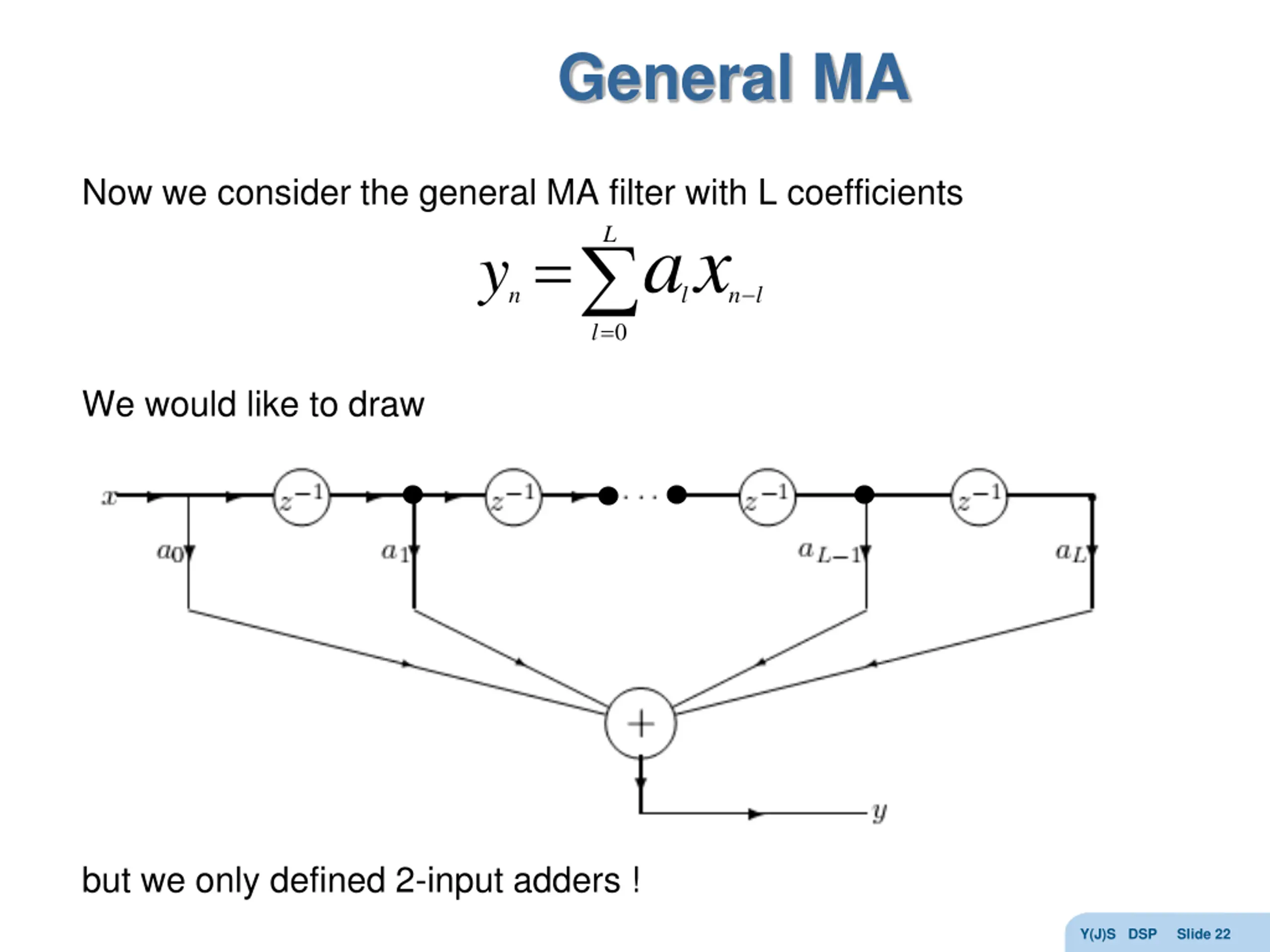 General MA Now we consider the general MA filter with L coefficients y a x L = = l n l n l 0 We would like to draw but we only defined 2-input adders ! Y(J)S DSP Slide 22
