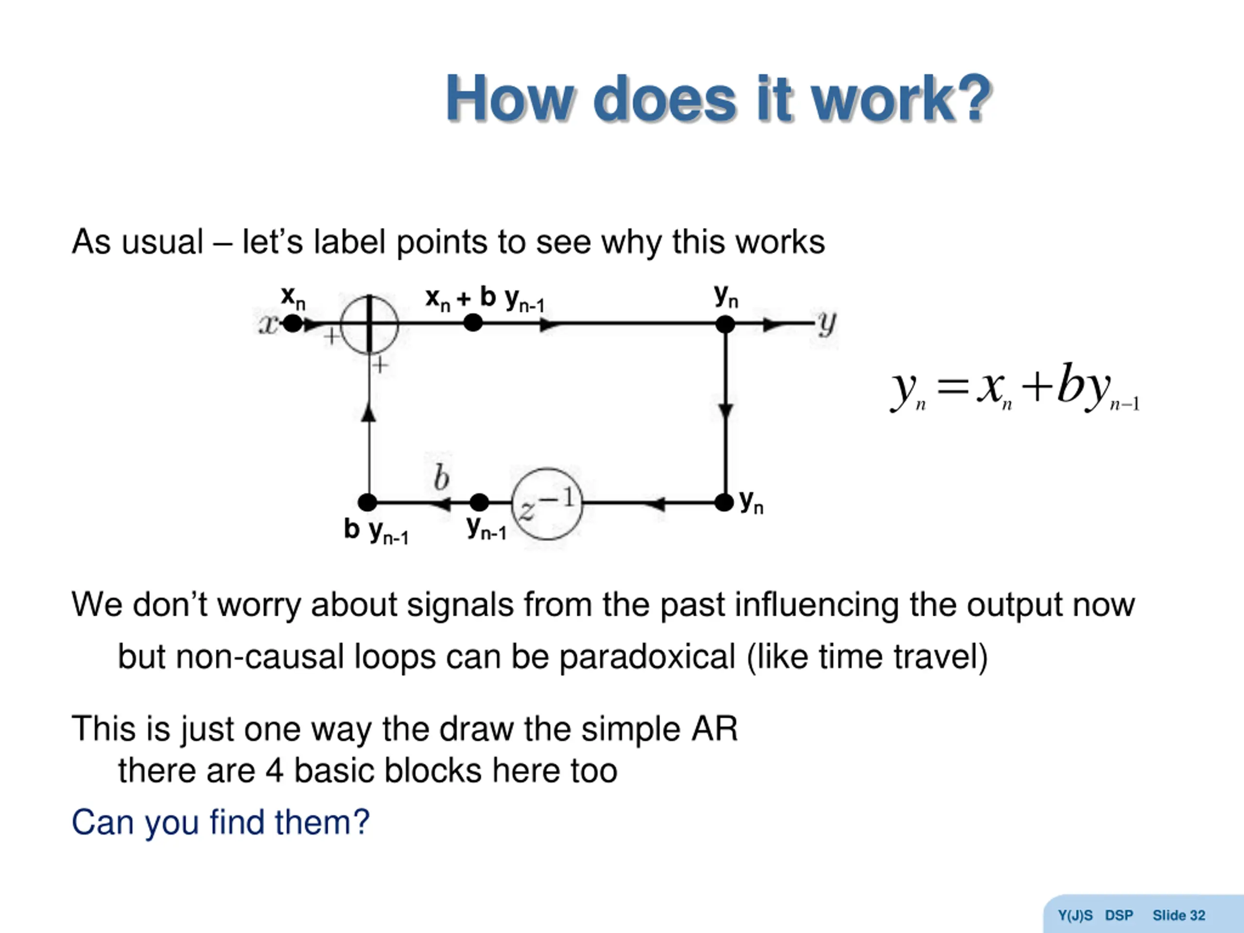 How does it work? As usual let s label points to see why this works yn n xn n xn n + b yn n- -1 1 = + y x by 1 n n n yn n yn n- -1 1 b yn n- -1 1 We don t worry about signals from the past influencing the output now but non-causal loops can be paradoxical (like time travel) This is just one way the draw the simple AR there are 4 basic blocks here too Can you find them? Y(J)S DSP Slide 32