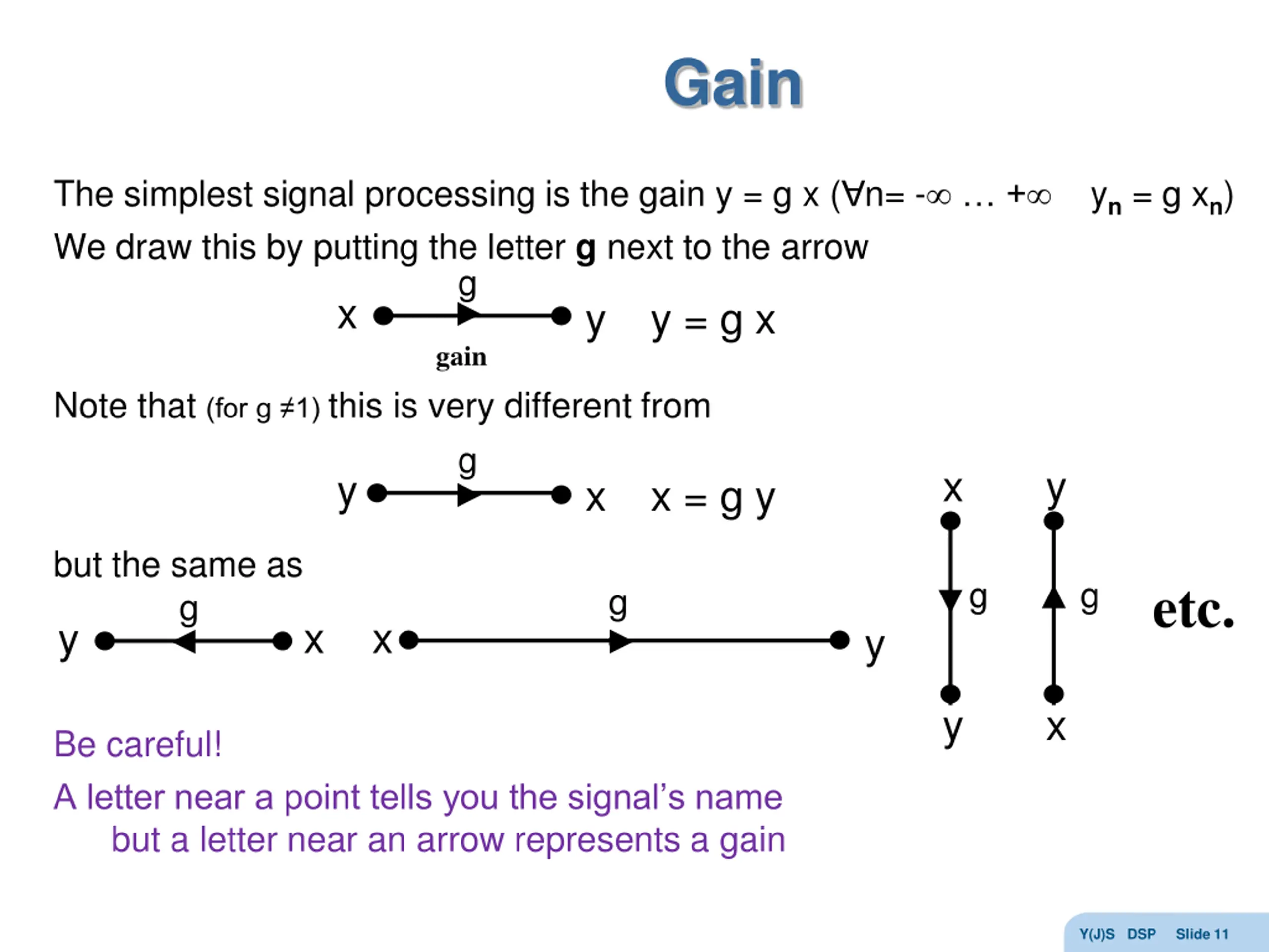 Gain The simplest signal processing is the gain y = g x ( n= - + yn = g xn) We draw this by putting the letter g next to the arrow x y gain g y = g x Note that (for g 1) this is very different from g x y y x x = g y but the same as etc. g g g g x x y y y x Be careful! A letter near a point tells you the signal s name but a letter near an arrow represents a gain Y(J)S DSP Slide 11