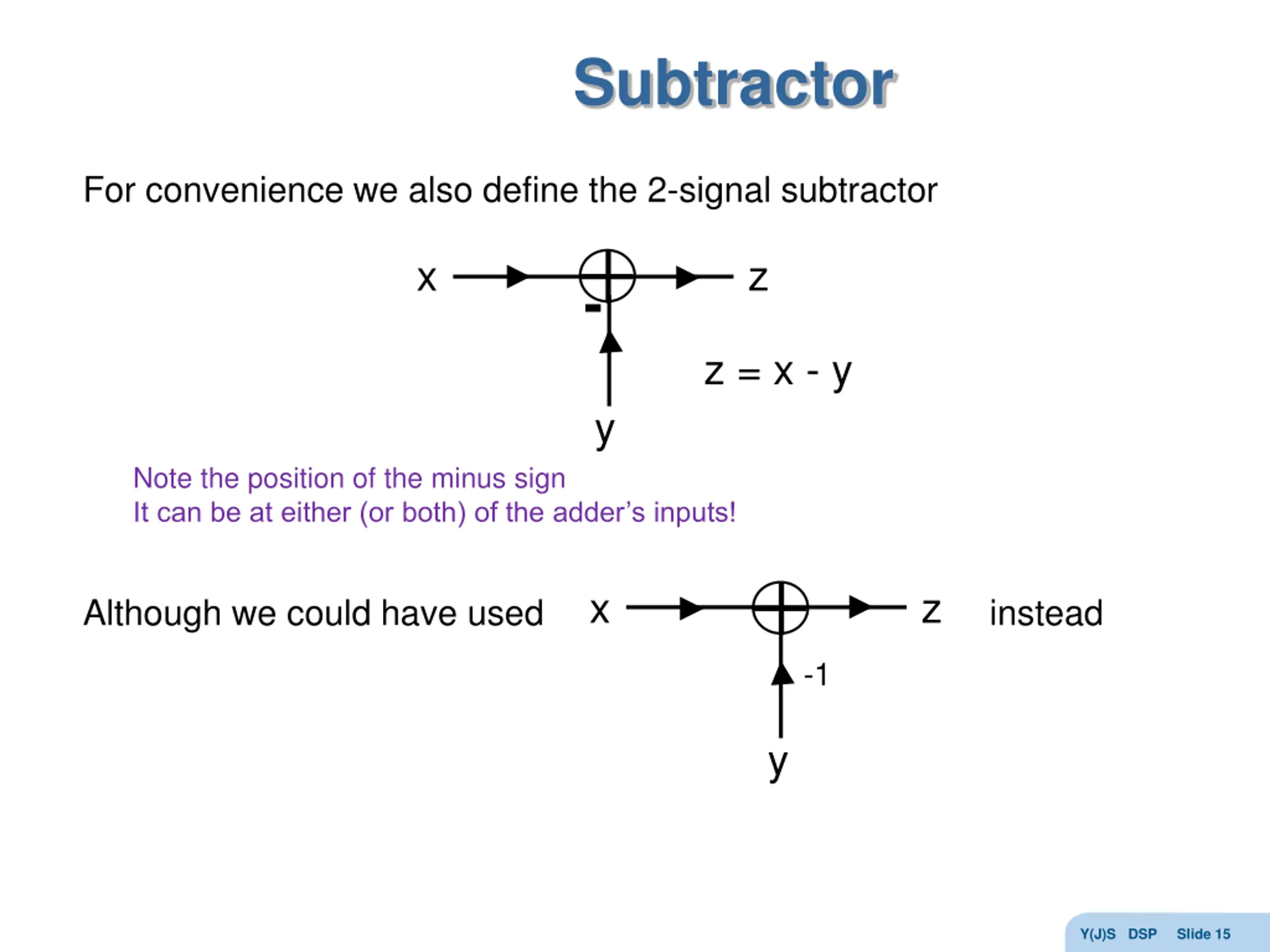 Subtractor For convenience we also define the 2-signal subtractor x z - z = x - y y Note the position of the minus sign It can be at either (or both) of the adder s inputs! Although we could have used instead x z -1 y Y(J)S DSP Slide 15