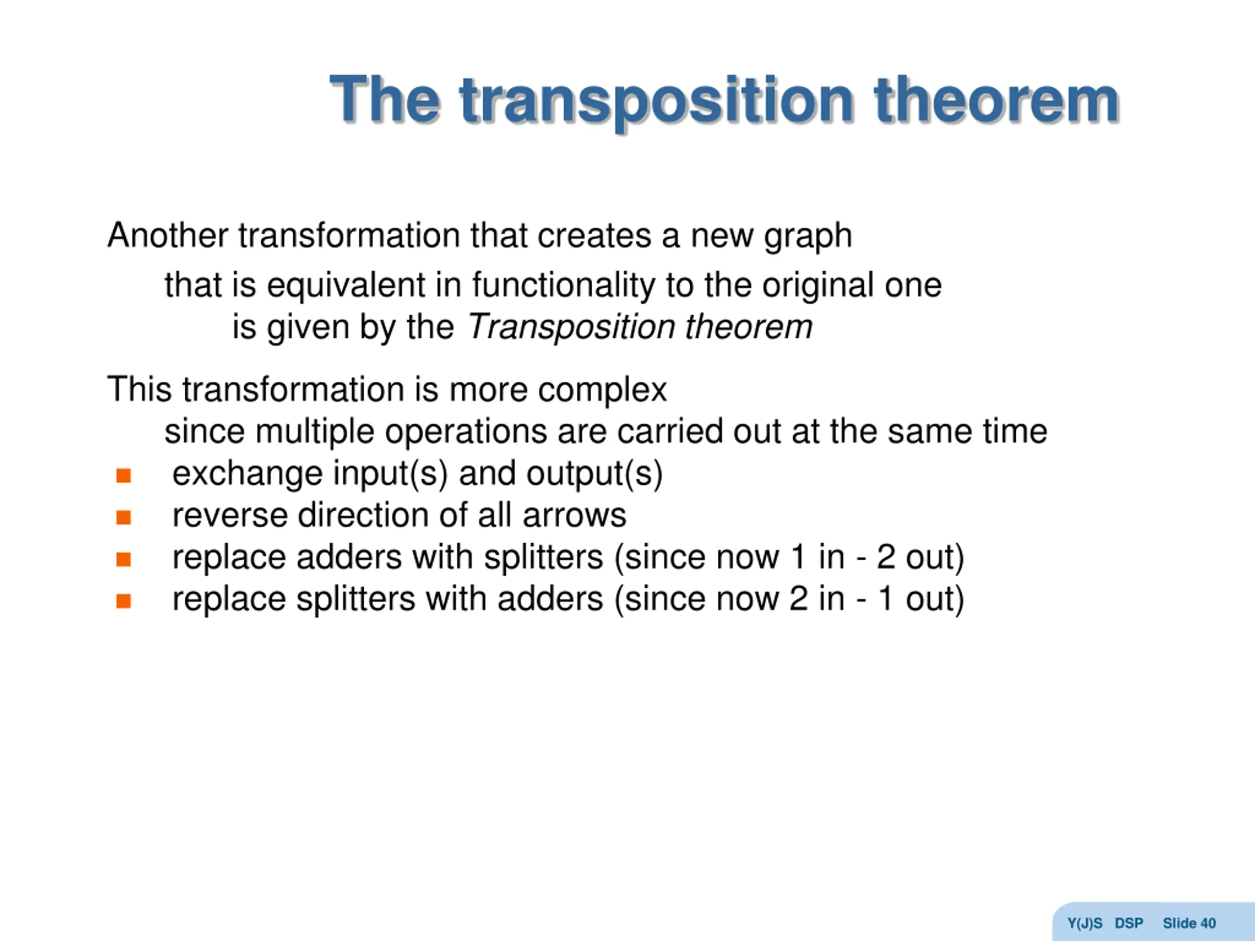 The transposition theorem Another transformation that creates a new graph that is equivalent in functionality to the original one is given by the Transposition theorem This transformation is more complex since multiple operations are carried out at the same time exchange input(s) and output(s) reverse direction of all arrows replace adders with splitters (since now 1 in - 2 out) replace splitters with adders (since now 2 in - 1 out) Y(J)S DSP Slide 40