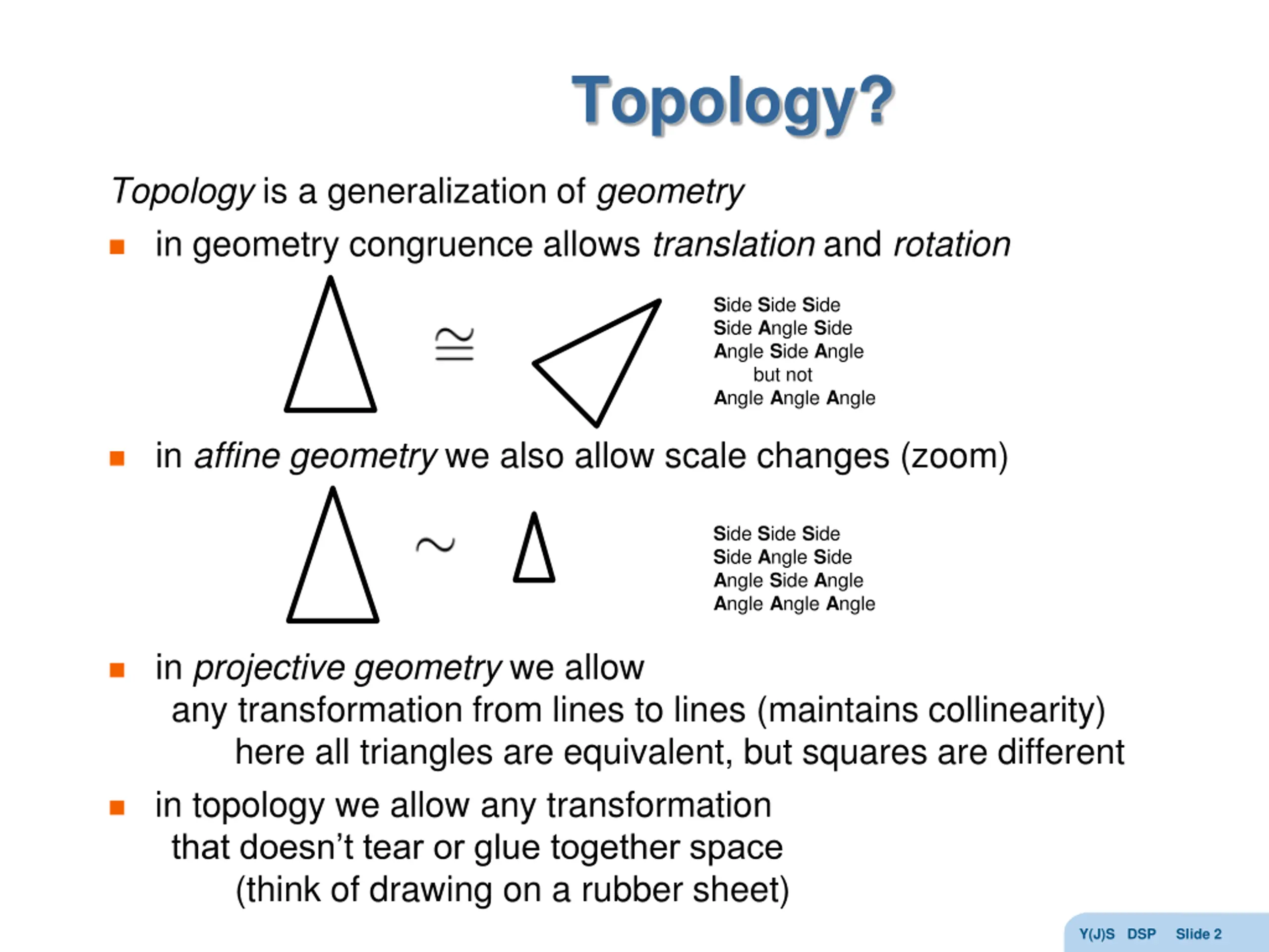 Topology? Topology is a generalization of geometry in geometry congruence allows translation and rotation Side Side Side Side Angle Side Angle Side Angle but not Angle Angle Angle in affine geometry we also allow scale changes (zoom) Side Side Side Side Angle Side Angle Side Angle Angle Angle Angle in projective geometry we allow any transformation from lines to lines (maintains collinearity) here all triangles are equivalent, but squares are different in topology we allow any transformation that doesn t tear or glue together space (think of drawing on a rubber sheet) Y(J)S DSP Slide 2
