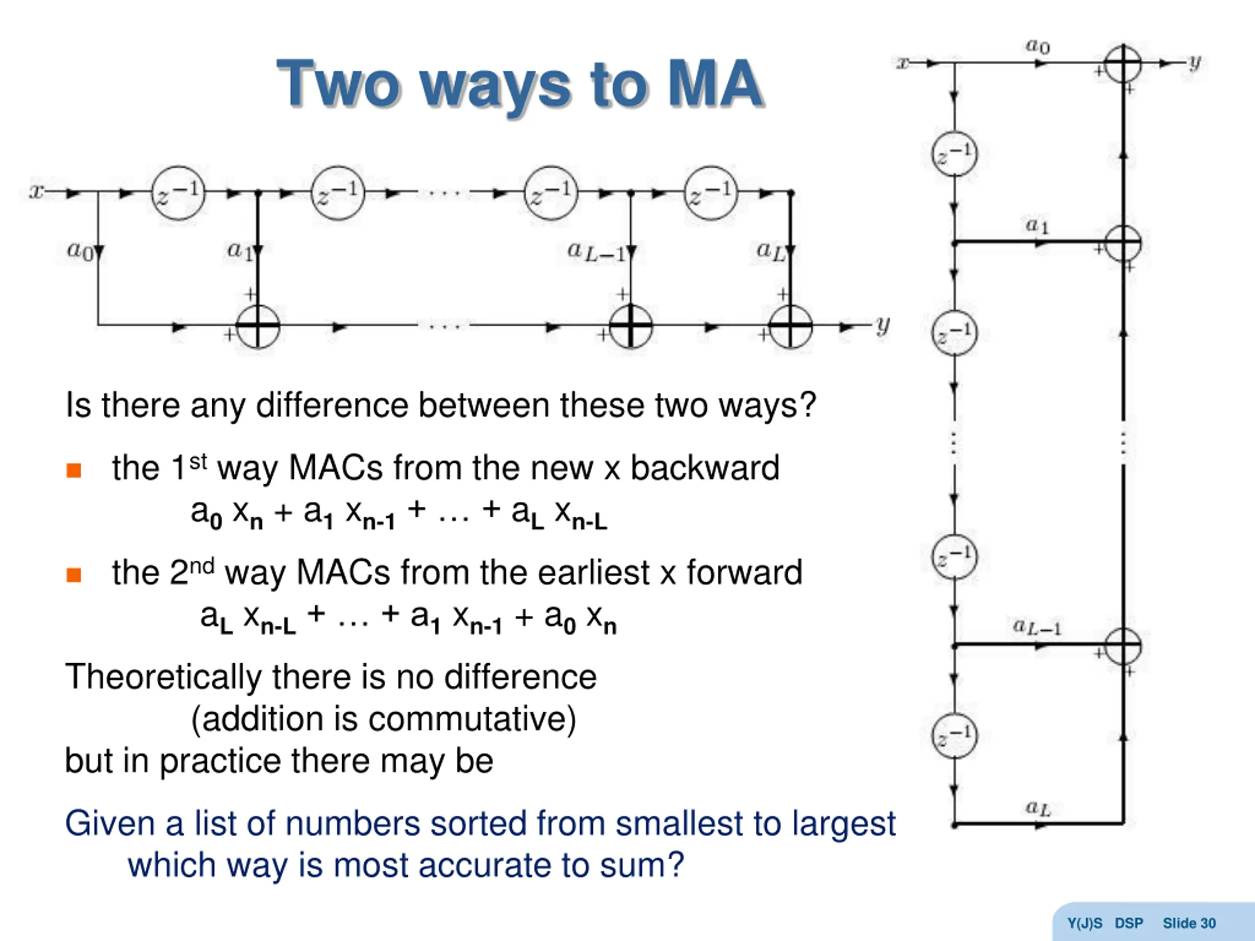 Two ways to MA Is there any difference between these two ways? the 1st way MACs from the new x backward a0 xn + a1 xn-1+ + aL xn-L the 2nd way MACs from the earliest x forward aL xn-L+ + a1 xn-1 + a0 xn Theoretically there is no difference (addition is commutative) but in practice there may be Given a list of numbers sorted from smallest to largest which way is most accurate to sum? Y(J)S DSP Slide 30