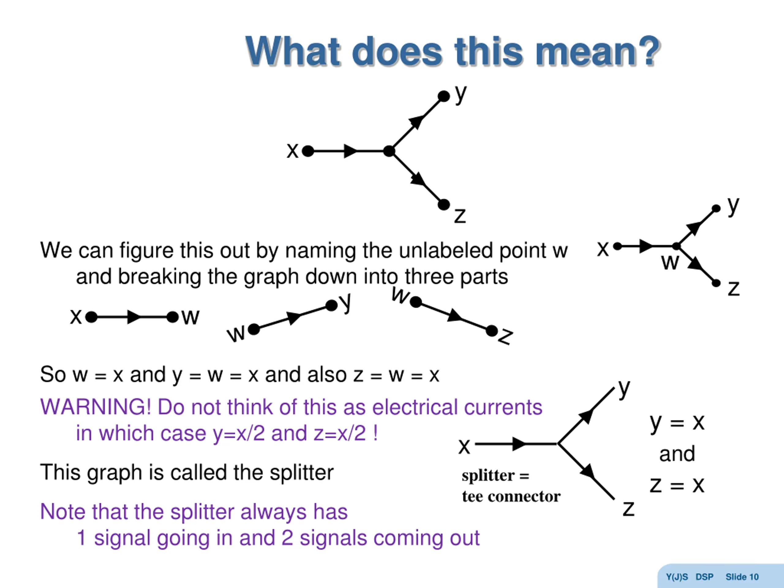 What does this mean? y x y z x We can figure this out by naming the unlabeled point w and breaking the graph down into three parts x w w z So w = x and y = w = x and also z = w = x WARNING! Do not think of this as electrical currents in which case y=x/2 and z=x/2 ! y y = x and z = x x splitter = tee connector This graph is called the splitter z Note that the splitter always has 1 signal going in and 2 signals coming out Y(J)S DSP Slide 10