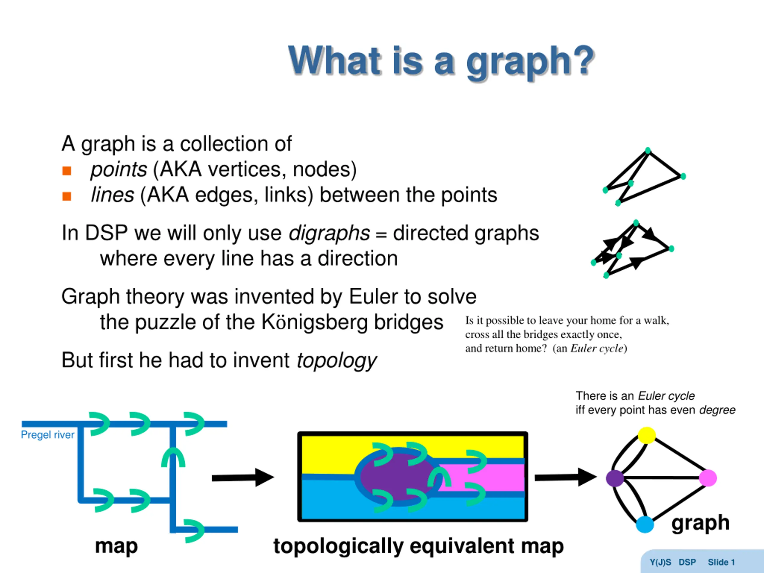 What is a graph? A graph is a collection of points (AKA vertices, nodes) lines (AKA edges, links) between the points In DSP we will only use digraphs = directed graphs where every line has a direction Graph theory was invented by Euler to solve the puzzle of the K onigsberg bridges Is it possible to leave your home for a walk, cross all the bridges exactly once, and return home? (an Euler cycle) But first he had to invent topology There is an Euler cycle iff every point has even degree Pregel river graph map topologically equivalent map Y(J)S DSP Slide 1