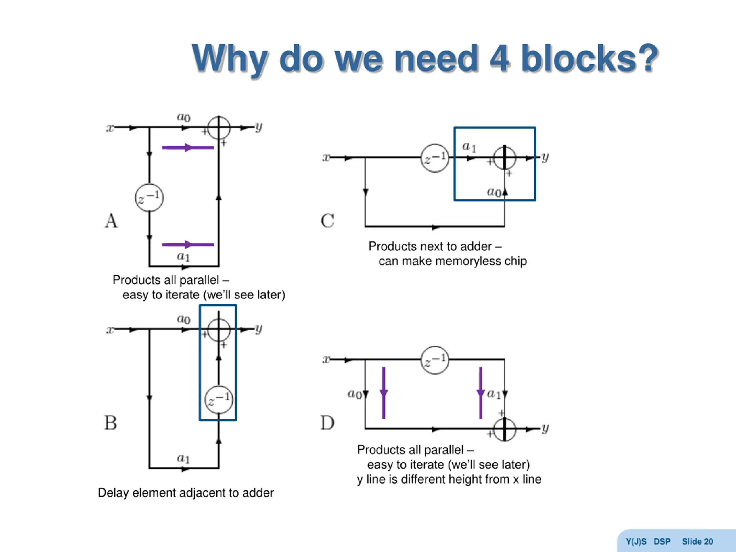 Why do we need 4 blocks? Products next to adder can make memoryless chip Products all parallel easy to iterate (we ll see later) Products all parallel easy to iterate (we ll see later) y line is different height from x line Delay element adjacent to adder Y(J)S DSP Slide 20