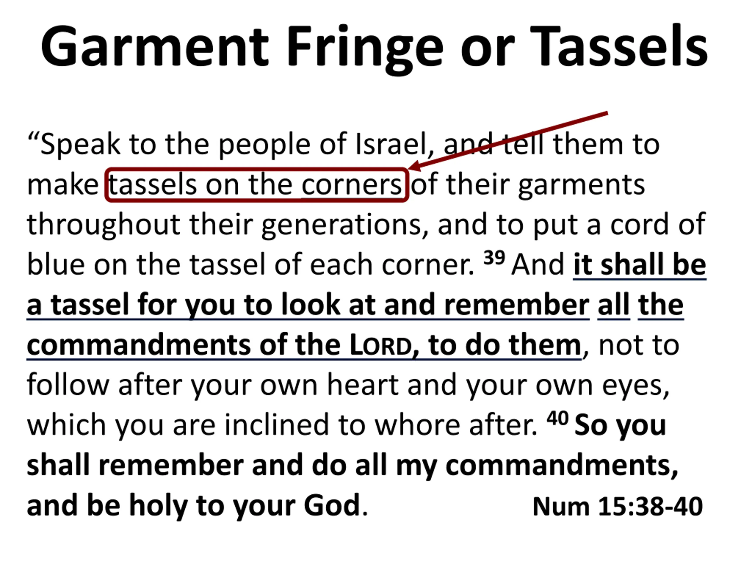 Garment Fringe or Tassels Speak to the people of Israel, and tell them to make tassels on the corners of their garments throughout their generations, and to put a cord of blue on the tassel of each corner. 39And it shall be a tassel for you to look at and rememberall the commandments of the LORD, to do them, not to follow after your own heart and your own eyes, which you are inclined to whore after. 40So you shall remember and do all my commandments, and be holy to your God. Num 15:38-40