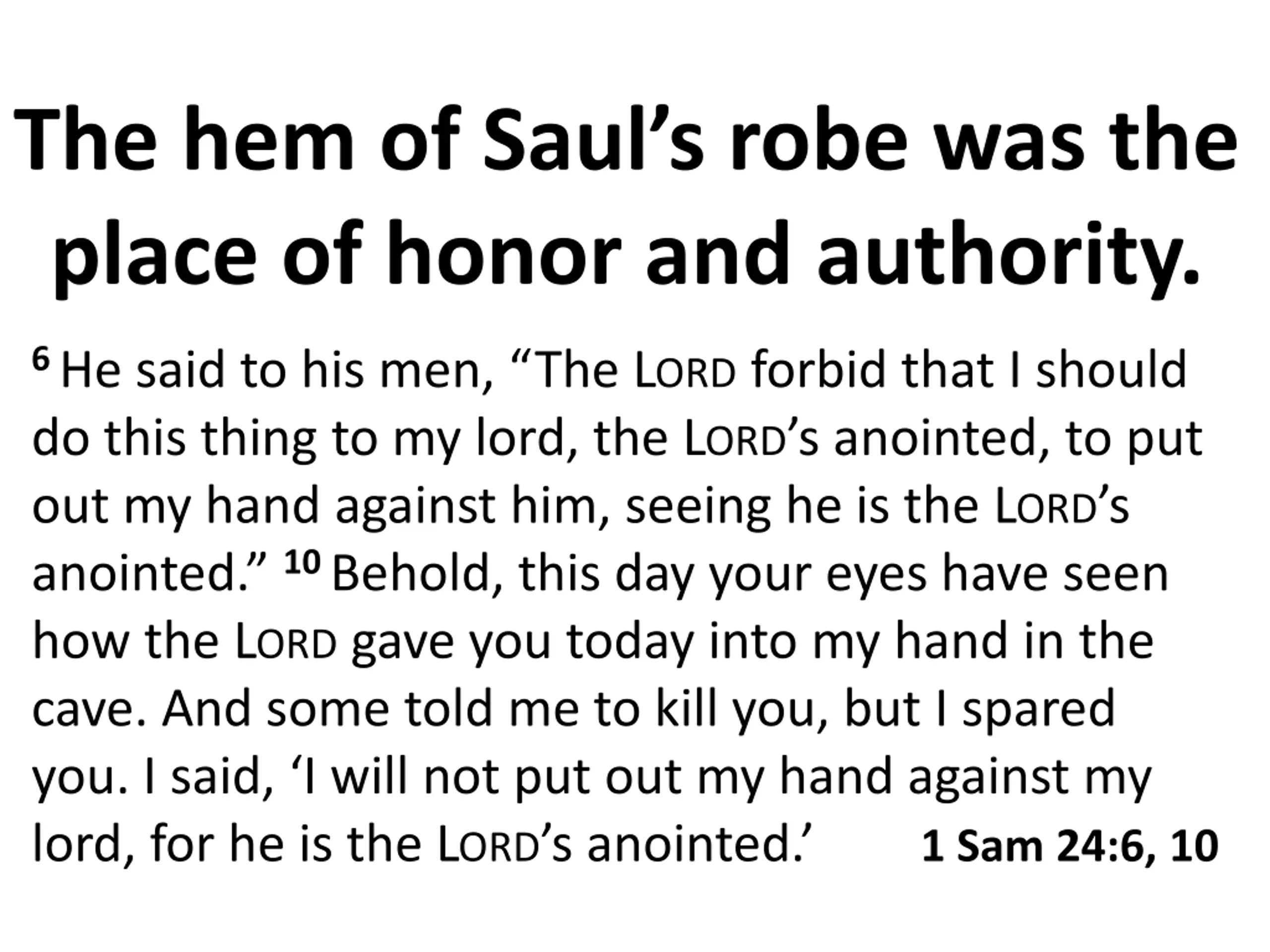 The hem of Sauls robe was the place of honor and authority. 6He said to his men, The LORD forbid that I should do this thing to my lord, the LORD s anointed, to put out my hand against him, seeing he is the LORD s anointed. 10Behold, this day your eyes have seen how the LORD gave you today into my hand in the cave. And some told me to kill you, but I spared you. I said, I will not put out my hand against my lord, for he is the LORD s anointed. 1 Sam 24:6, 10